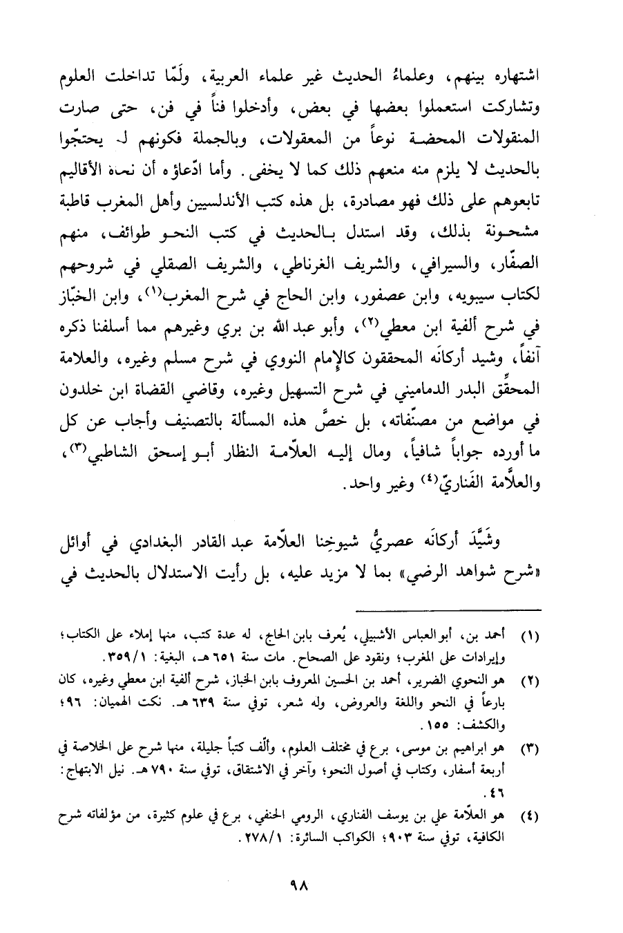 اشتهاره بينهم, وعلماء الحديث غير علماء العربية, ولما تداخلت العلوم وتشاركت استعملوا بعضها في بعض, وأدخلوا فنًا في فن, حتى صارت المنقولات المحضة نوعًا من المعقولات, وبالجملة فكونهم ** يحتجوا بالحديث لا يلزم منه منعهم ذلك كما لا يخفى. وأما ادعاؤه أن ** الأقاليم تابعوهم على ذلك فهو مصادرة, بل هذه كتب الأندلسيين وأهل المغرب قاطبة مشحونة بذلك, وقد استدل بالحديث في كتب النحو طوائف, منهم الصفار, والسيرافي, والشريف الغرناطي, والشريف الصقلي في شروحهم لكتاب سيبويه, وابن عصفور, وابن الحاج في شرح المغرب, وابن الخباز في شرح ألفية ابن معطي, وأبو عبد الله بن بري وغيرهم مما أسلفنا ذكره آنفًا, وشيد أركانه المحققون كالإمام النووي في شرح مسلم وغيره, والعلامة المحقق البدر الدماميني في شرح التسهيل وغيره, وقاضي القضاة ابن خلدون في مواضع من مصنفاته, بل خص هذه المسألة بالتصنيف وأجاب عن كل ما أورده جوابًا شافيًا, ومال إليه العلامة النظار أبو إسحق الشاطبي, والعلامة القناري وغير واحد.