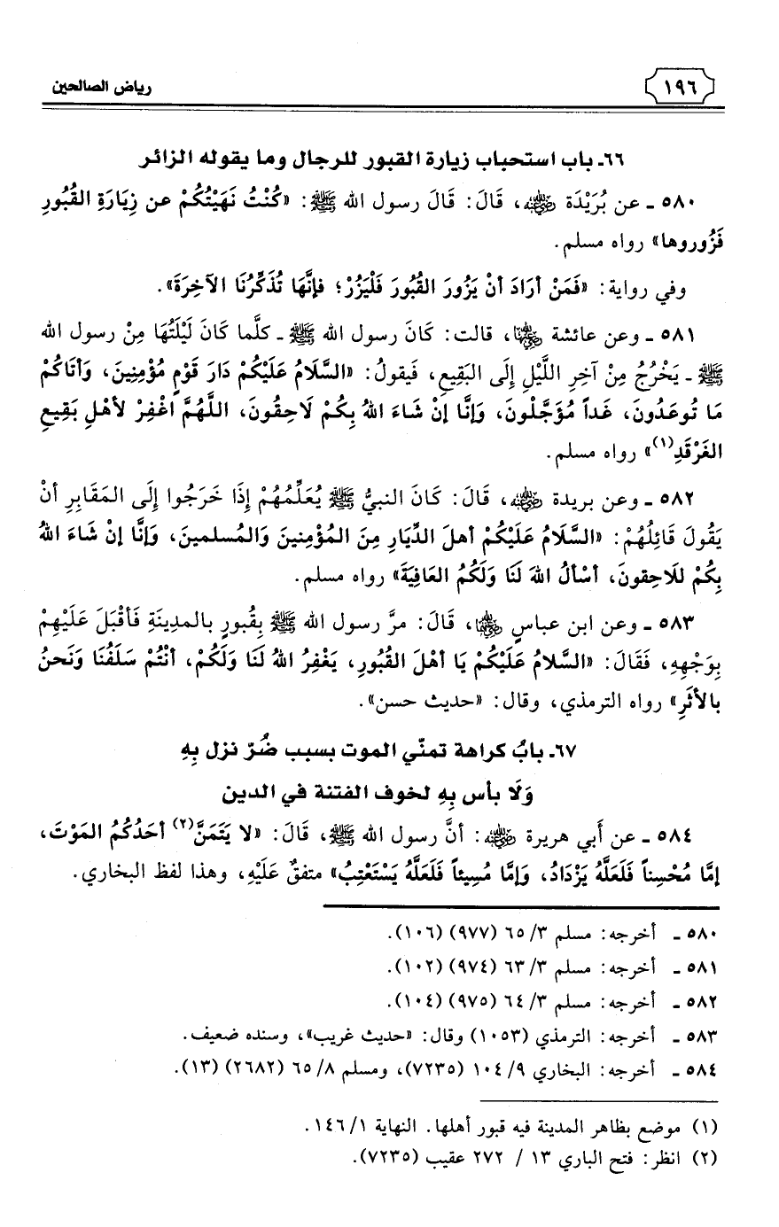 580 - عن بُرَيْدَة - رضي الله عنه - قَالَ: قَالَ رسول الله - صلى الله عليه وسلم: «كُنْتُ نَهَيْتُكُمْ عن زِيَارَةِ القُبُورِ فَزُوروها». رواه مسلم. (¬1)