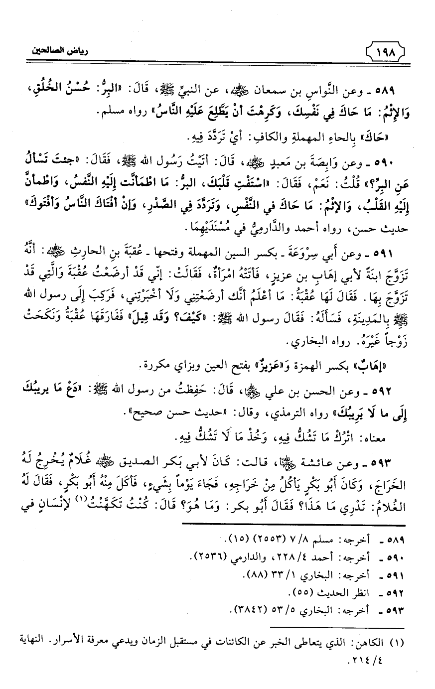 589 - وعن النَّواسِ بن سمعان - رضي الله عنه - عن النبيِّ - صلى الله عليه وسلم - قَالَ: «البِرُّ: حُسْنُ الخُلُقِ، وَالإِثْمُ: مَا حَاكَ فِي نَفْسِكَ، وَكَرِهْتَ أَنْ يَطَّلِعَ عَلَيْهِ النَّاسُ». رواه مسلم. (¬1)