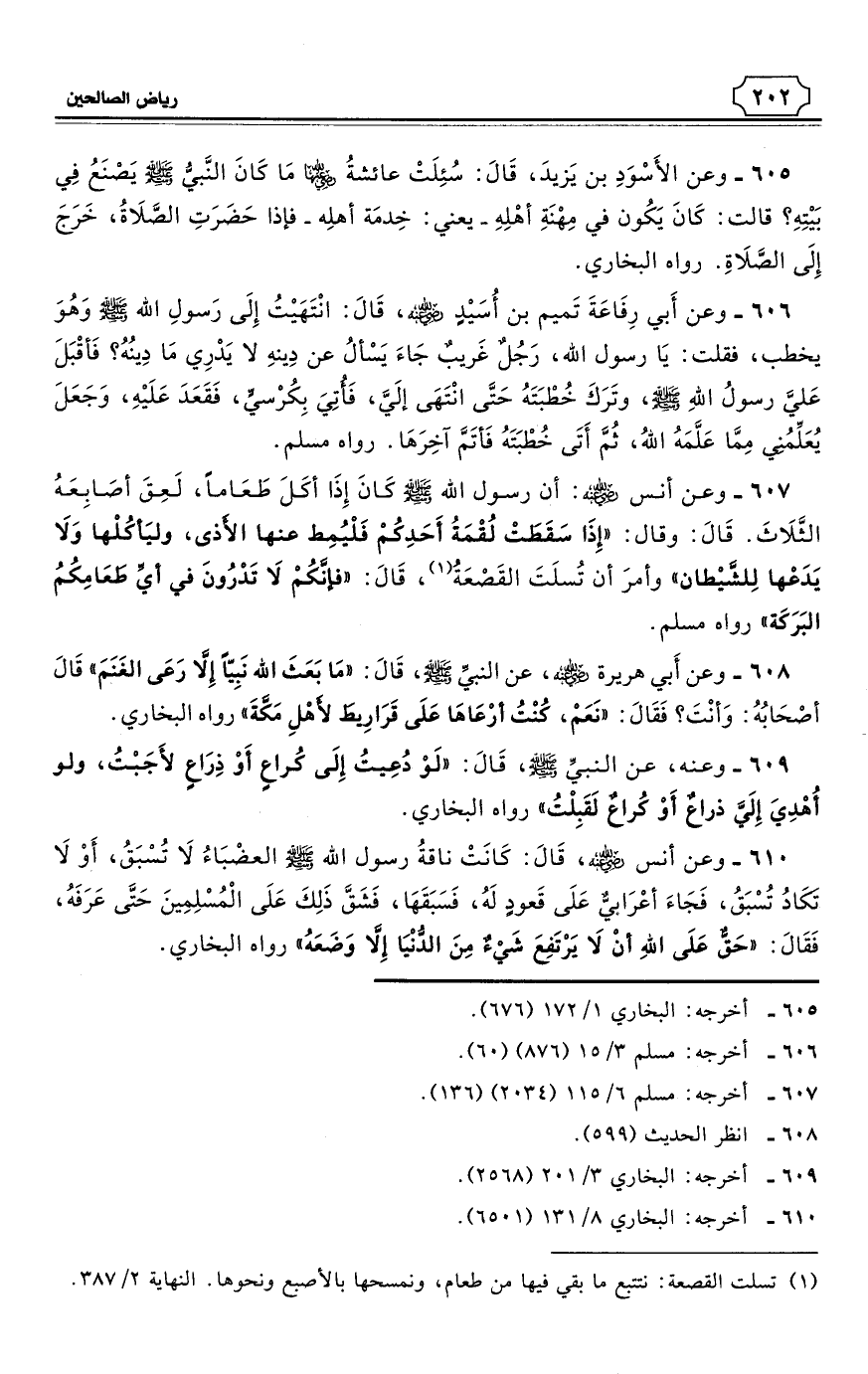 605 - وعن الأَسْوَدِ بن يَزيدَ، قَالَ: سُئِلَتْ عائشةُ رضي الله عنها مَا كَانَ النَّبيُّ - صلى الله عليه وسلم - يَصْنَعُ فِي بَيْتِهِ؟ قالت: كَانَ يَكُون في مِهْنَةِ أهْلِهِ - يعني: خِدمَة أهلِه - فإذا حَضَرَتِ الصَّلاَةُ، خَرَجَ إِلَى الصَّلاَةِ. رواه البخاري. (¬1)