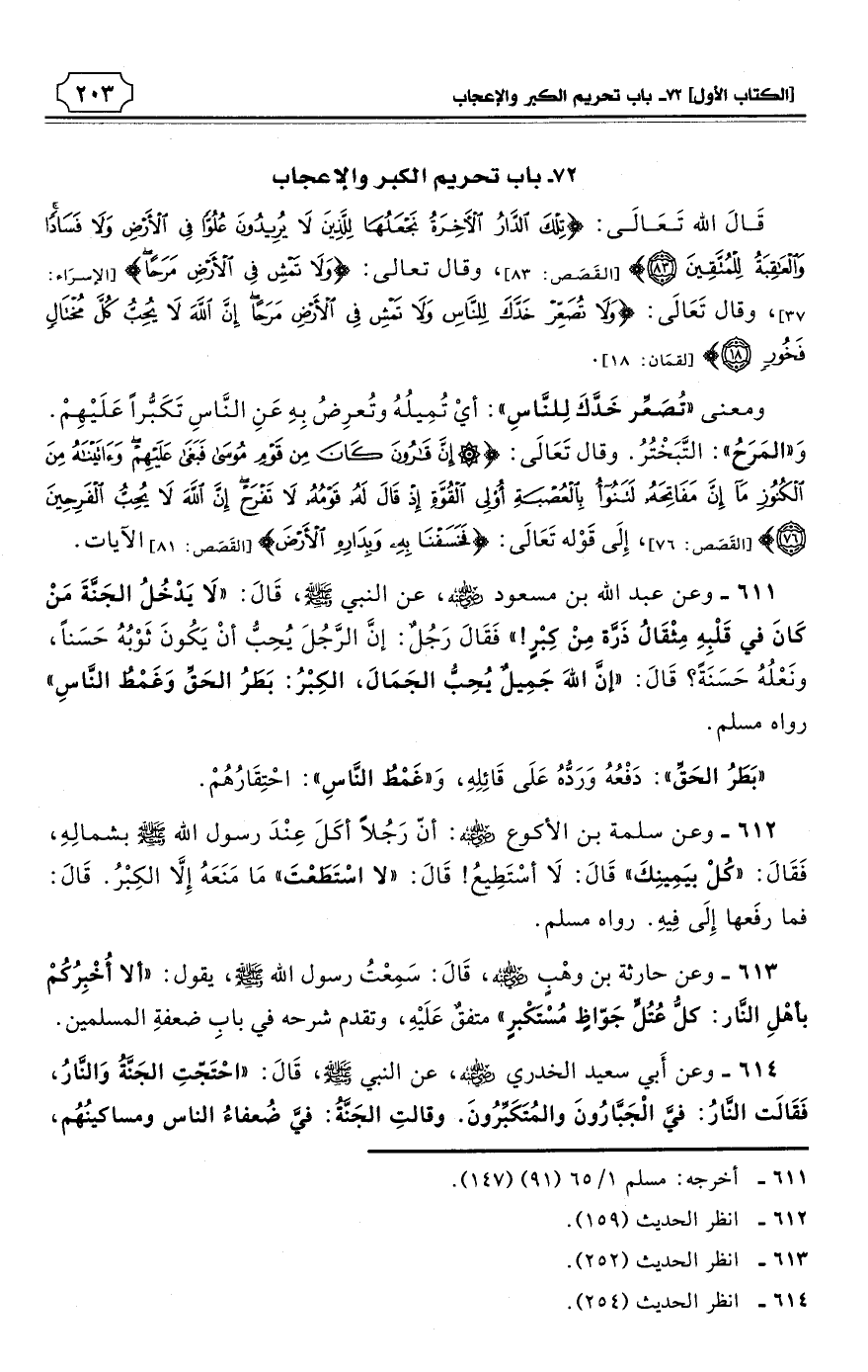 611 - وعن عبد الله بن مسعود - رضي الله عنه - عن النبي - صلى الله عليه وسلم - قَالَ: «لاَ يَدْخُلُ الجَنَّةَ مَنْ كَانَ في قَلْبِهِ مِثْقَالُ ذَرَّة مِنْ كِبْرٍ!» فَقَالَ رَجُلٌ: إنَّ الرَّجُلَ يُحِبُّ أَنْ يَكُونَ ثَوْبُهُ حَسَنًا، ونَعْلُهُ حَسَنَةً؟ قَالَ: «إنَّ اللهَ جَمِيلٌ يُحِبُّ الجَمَالَ، الكِبْرُ: بَطَرُ الحَقِّ وَغَمْطُ النَّاسِ». رواه مسلم. (¬1)