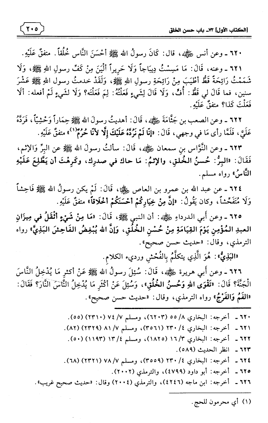 620 - وعن أنس - رضي الله عنه - قال: كَانَ رسولُ الله - صلى الله عليه وسلم - أحْسَنَ النَّاس خُلُقًا. متفقٌ عَلَيْهِ. (¬1)