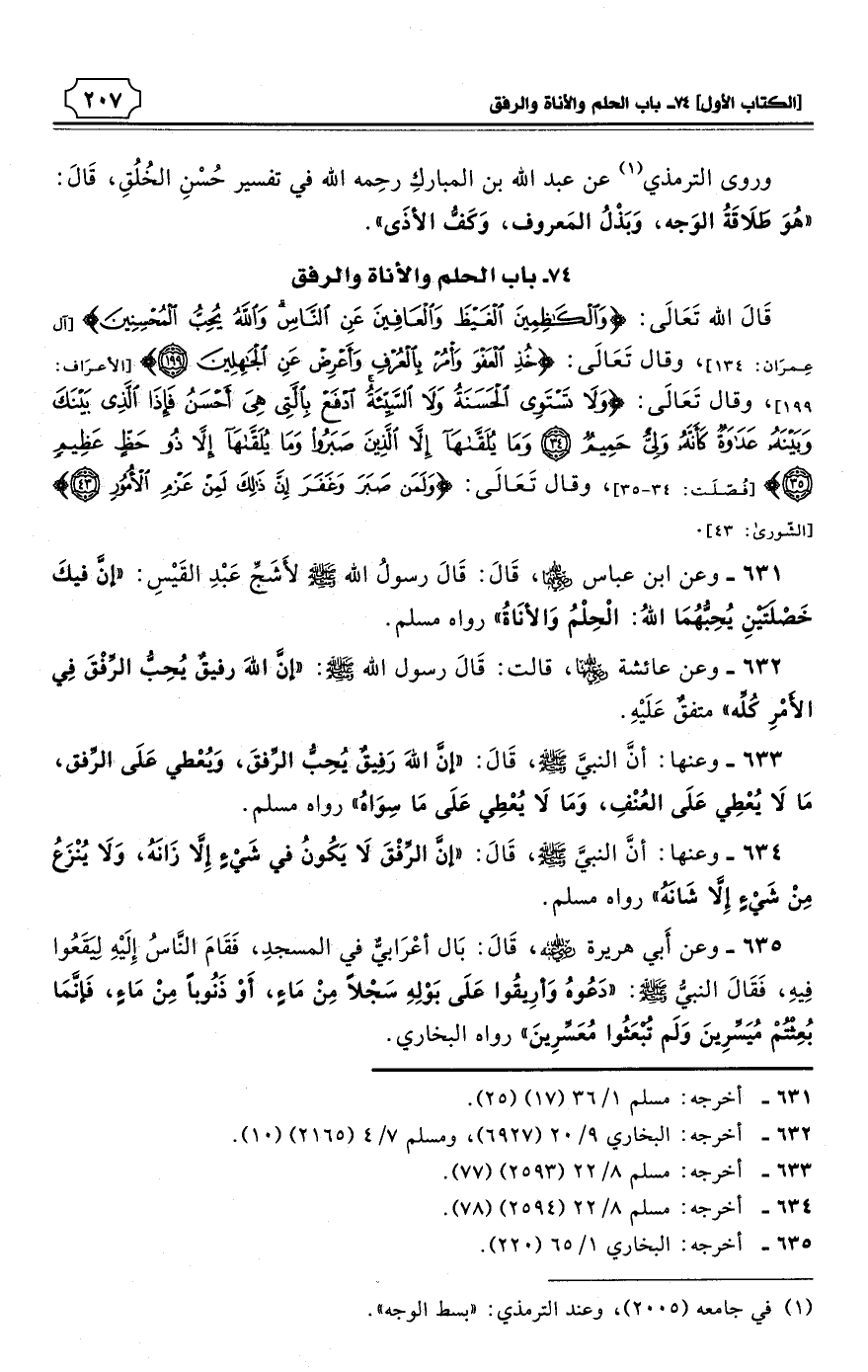 631 - وعن ابن عباس رضي الله عنهما، قَالَ: قَالَ رسولُ الله - صلى الله عليه وسلم - لأَشَجِّ عَبْدِ القَيْسِ: «إنَّ فيكَ خَصْلَتَيْنِ يُحِبُّهُمَا اللهُ: الْحِلْمُ وَالأنَاةُ». رواه مسلم. (¬1)