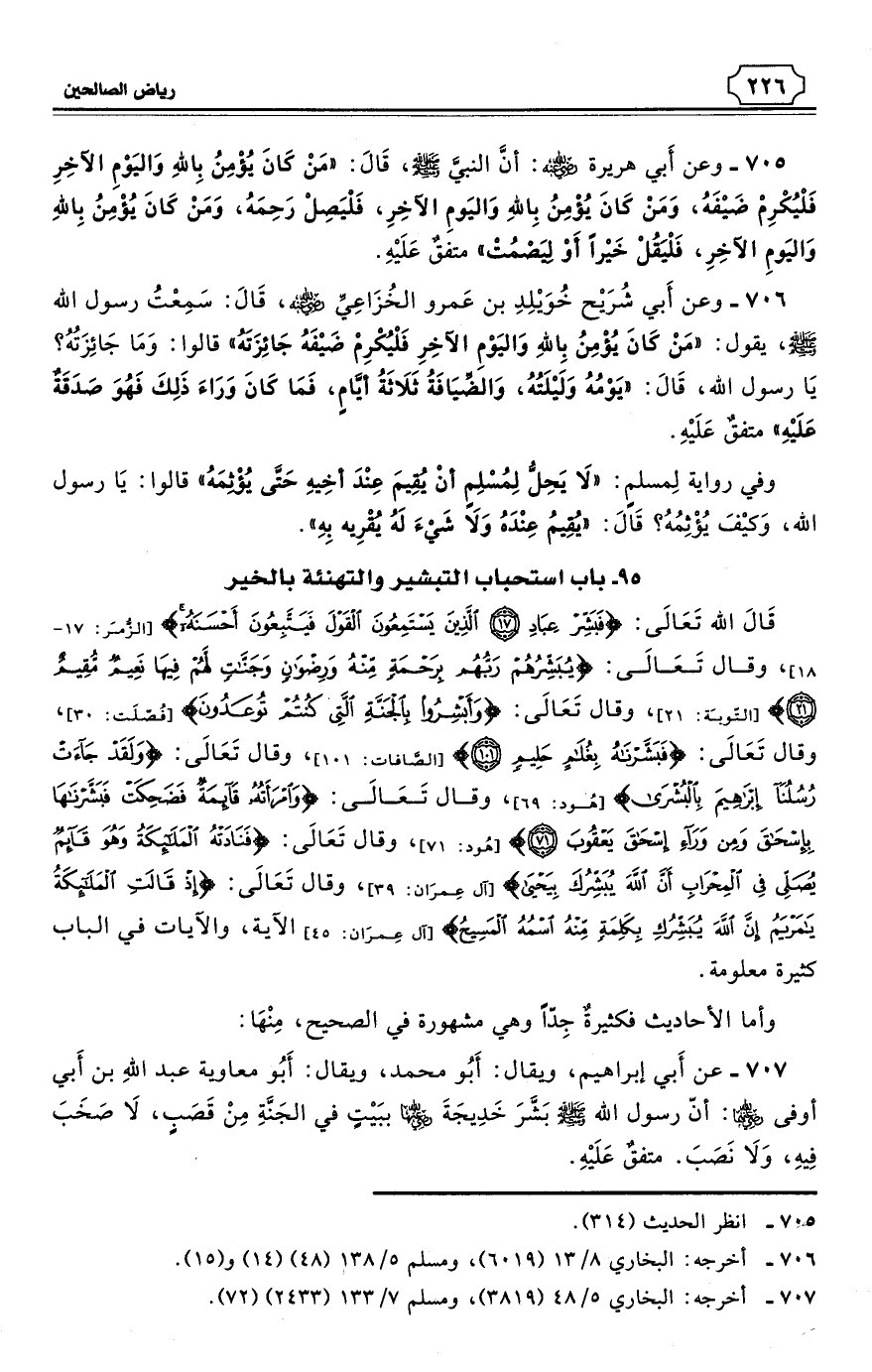 706 - وعن أَبي شُرَيْح خُوَيْلِدِ بن عَمرو الخُزَاعِيِّ - رضي الله عنه - قَالَ: سَمِعْتُ رسول الله - صلى الله عليه وسلم - يقول: «مَنْ كَانَ يُؤْمِنُ بِاللهِ وَاليَوْمِ الآخِرِ فَلْيُكْرِمْ ضَيْفَهُ جَائِزَتَهُ»