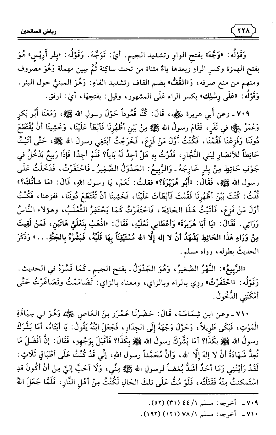709 - وعن أَبي هريرة - رضي الله عنه - قَالَ: كُنَّا قُعُودًا حَوْلَ رسولِ الله - صلى الله عليه وسلم - وَمَعَنَا أَبُو بَكرٍ وَعُمَرُ رضي الله عنهما في نَفَرٍ، فَقَامَ رسولُ الله - صلى الله عليه وسلم - مِنْ بَيْنِ أظْهُرِنَا فَأبْطَأ عَلَيْنَا، وَخَشِينَا أَنْ يُقْتَطَعَ دُونَنَا وَفَزِعْنَا فَقُمْنَا، فَكُنْتُ أَوَّلَ مَنْ فَزِعَ، فَخَرَجْتُ أبْتَغِي رسولَ الله - صلى الله عليه وسلم - حَتَّى أتَيْتُ حَائِطًا للأنصَارِ لِبَني النَّجَارِ، فَدُرْتُ بِهِ هَلْ أجِدُ لَهُ بَابًا؟ فَلَمْ أجِدْ! فَإذَا رَبيعٌ يَدْخُلُ في جَوْفِ حَائِطٍ مِنْ بِئْرٍ خَارِجَهُ - وَالرَّبِيعُ: الجَدْوَلُ الصَّغِيرُ - فَاحْتَفَرْتُ، فَدَخَلْتُ عَلَى رسول الله - صلى الله عليه وسلم - فَقَالَ: «أَبُو هُرَيْرَةَ؟» فقلتُ: نَعَمْ، يَا رسول اللهِ، قَالَ: «مَا شأنُكَ؟» قُلْتُ: كُنْتَ بَيْنَ أظْهُرِنَا فَقُمْتَ فَأبْطَأتَ عَلَيْنَا، فَخَشِينَا أَنْ تُقْتَطَعَ دُونَنَا، ففزعنا، فَكُنْتُ أوّلَ مَنْ فَزِعَ، فَأتَيْتُ هَذَا الحَائِطَ، فَاحْتَفَرْتُ كَمَا يَحْتَفِرُ الثَّعْلَبُ، وهؤلاء النَّاسُ وَرَائِي. فَقَالَ: «يَا أَبَا هُرَيرَةَ» وَأعْطَانِي نَعْلَيْهِ، فَقَالَ: «اذْهَبْ بِنَعْلَيَّ هَاتَيْنِ، فَمَنْ لَقِيتَ مِنْ وَرَاءِ هَذَا الحَائِطِ يَشْهَدُ أَنْ لا إله إِلاَّ الله مُسْتَيْقِنًا بِهَا قَلْبُهُ، فَبَشِّرْهُ بِالجَنَّةِ ... » وَذَكَرَ الحديثَ بطوله، رواه مسلم. (¬1)