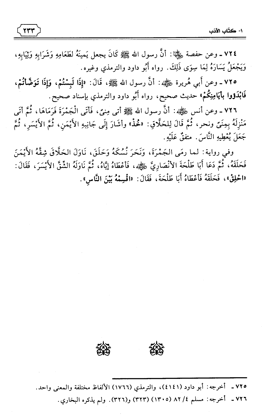 724 - وعن حفصة رضي الله عنها: أنَّ رسول الله - صلى الله عليه وسلم - كَانَ يجعل يَمينَهُ لطَعَامِهِ وَشَرَابِهِ وَثِيَابِهِ، وَيَجْعَلُ يَسَارَهُ لِمَا سِوَى ذَلِكَ. رواه أَبُو داود والترمذي وغيره. (¬1)