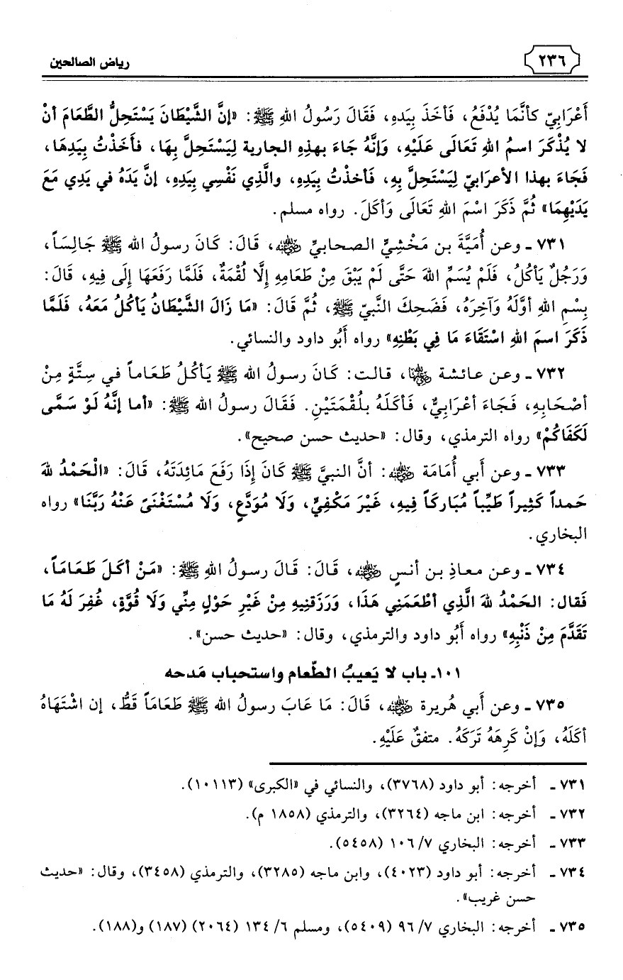 732 - وعن عائشة رضي الله عنها، قالت: كَانَ رسولُ الله - صلى الله عليه وسلم - يَأكُلُ طَعَامًا في سِتَّةٍ مِنْ أَصْحَابِهِ، فَجَاءَ أعْرَابِيٌّ، فَأكَلَهُ بلُقْمَتَيْنِ. فَقَالَ رسولُ الله - صلى الله عليه وسلم: «أما إنَّهُ لَوْ سَمَّى لَكَفَاكُمْ». رواه الترمذي، وقال: «حديث حسن صحيح». (¬1)