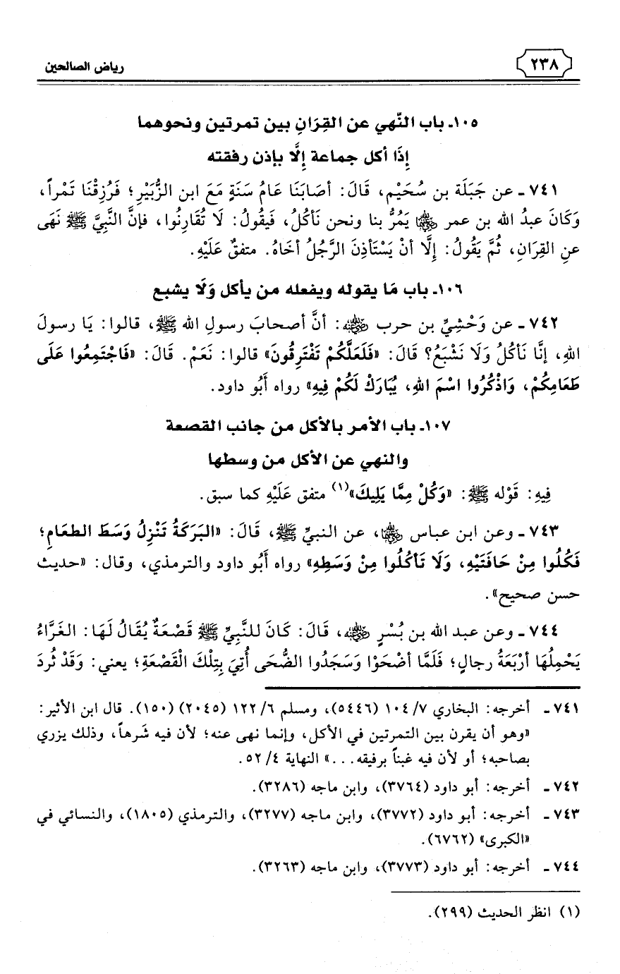743 - وعن ابن عباس رضي الله عنهما، عن النبيِّ - صلى الله عليه وسلم - قَالَ: «البَرَكَةُ تَنْزِلُ وَسَطَ الطعَامِ؛ فَكُلُوا مِنْ حَافَتَيْهِ، وَلاَ تَأكُلُوا مِنْ وَسَطِهِ». رواه أَبُو داود والترمذي، وقال: «حديث حسن صحيح». (¬2)