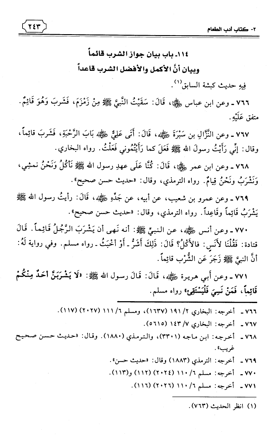 766 - وعن ابن عباس رضي الله عنهما، قَالَ: سَقَيْتُ النَّبيَّ - صلى الله عليه وسلم - مِنْ زَمْزَمَ، فَشَربَ وَهُوَ قَائِمٌ. متفق عَلَيْهِ (¬2).