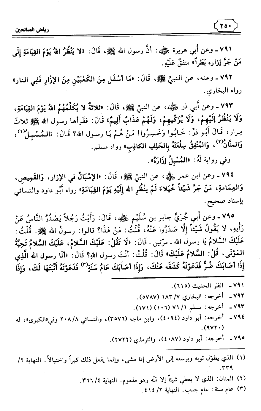 793 - وعن أَبي ذر - رضي الله عنه - عن النبيِّ - صلى الله عليه وسلم - قَالَ: «ثلاثةٌ لاَ يُكَلِّمُهُمُ اللهُ يَوْمَ القِيَامَةِ، وَلاَ يَنْظُرُ إلَيْهِمْ، وَلاَ يُزَكِّيهِمْ، وَلَهُمْ عَذَابٌ أَلِيمٌ» قَالَ: فقَرأها رسول الله - صلى الله عليه وسلم - ثلاثَ مِرار، قَالَ أَبُو ذرٍّ: خَابُوا وَخَسِرُوا! مَنْ هُمْ يَا رسول الله؟ قَالَ: «المُسْبِلُ (¬1)، وَالمنَّانُ (¬2)، وَالمُنْفِقُ سِلْعَتَهُ بِالحَلِفِ الكاذِبِ». رواه مسلم. (¬3)