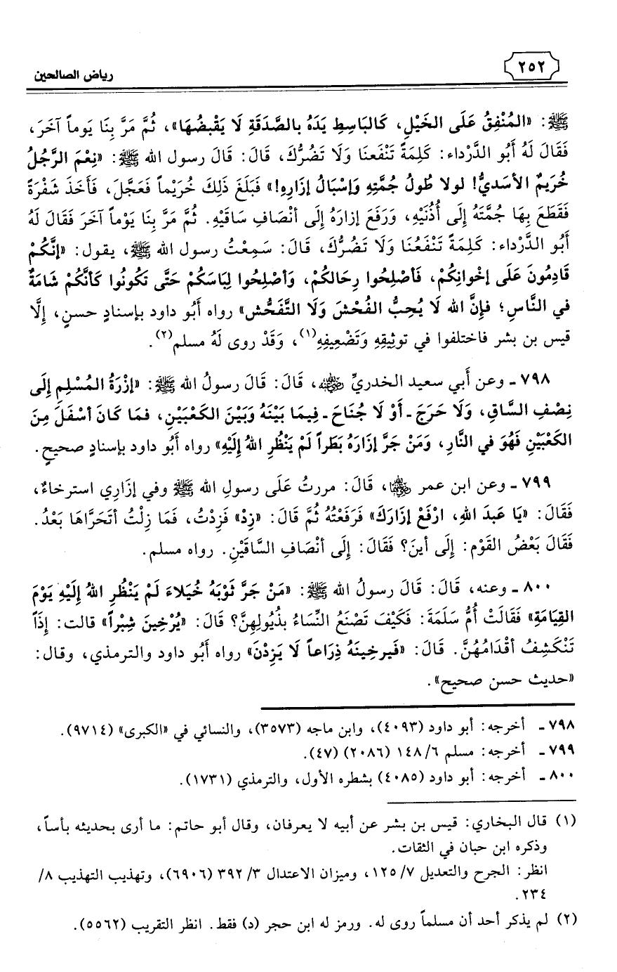 798 - وعن أَبي سعيد الخدريِّ - رضي الله عنه - قَالَ: قَالَ رسولُ الله - صلى الله عليه وسلم: «إزْرَةُ المُسْلِمِ إِلَى نِصْفِ السَّاقِ، وَلاَ حَرَجَ - أَوْ لاَ جُنَاحَ - فِيمَا بَيْنَهُ وَبَيْنَ الكَعْبَيْنِ، فمَا كَانَ أسْفَلَ مِنَ الكَعْبَيْنِ فَهُوَ في النَّارِ، وَمَنْ جَرَّ إزَارَهُ بَطَرًا لَمْ يَنْظُرِ اللهُ إِلَيْهِ». رواه أَبُو داود بإسنادٍ صحيحٍ. (¬1)