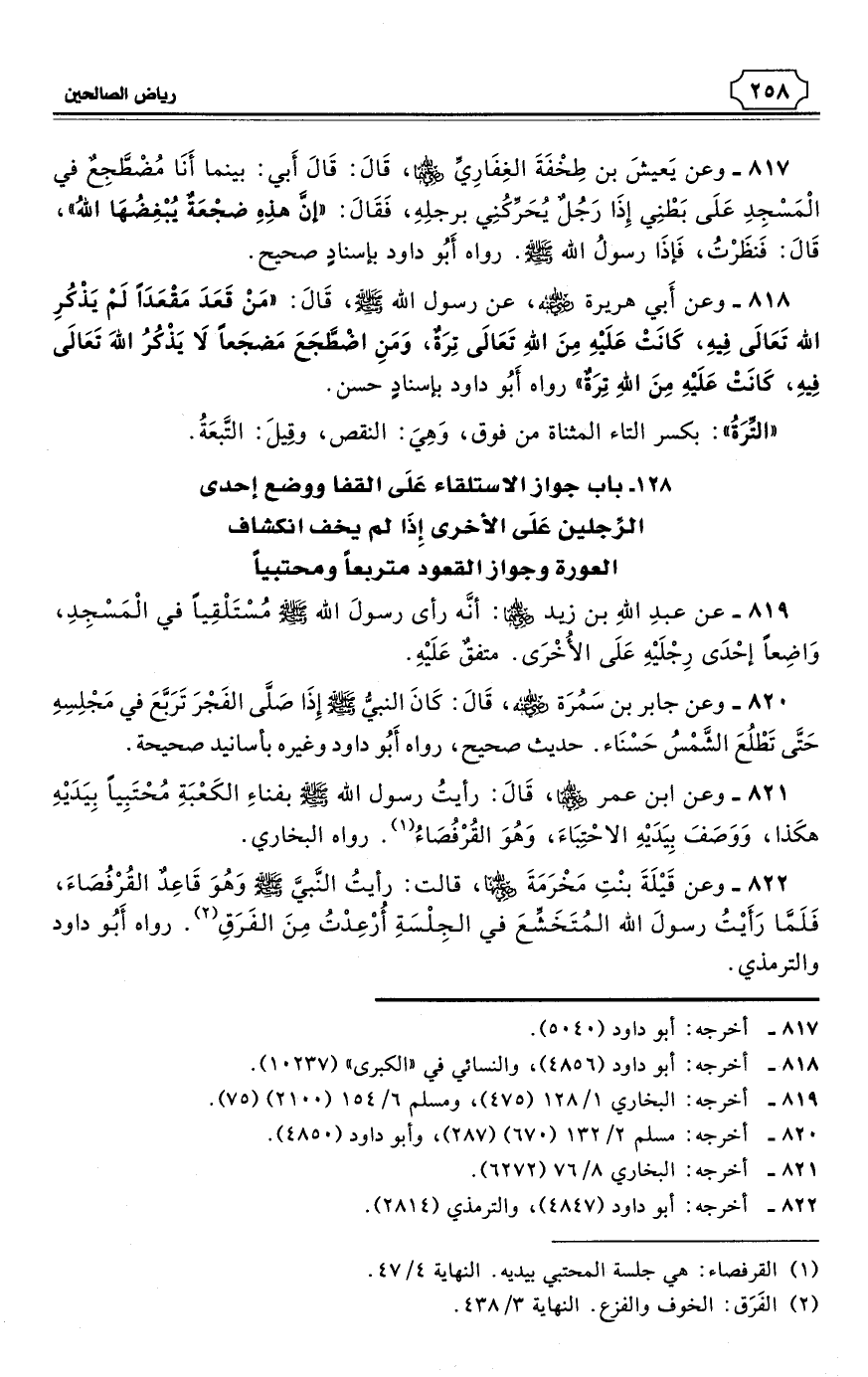 817 - وعن يَعيشَ بن طِخْفَةَ الغِفَارِيِّ رضي الله عنهما، قَالَ: قَالَ أَبي: بينما أَنَا مُضْطَجِعٌ في الْمَسْجِدِ عَلَى بَطْنِي إِذَا رَجُلٌ يُحَرِّكُنِي برجلِهِ، فَقَالَ: «إنَّ هذِهِ ضجْعَةٌ يُبْغِضُهَا اللهُ»، قَالَ: فَنظَرْتُ، فَإذَا رسولُ الله - صلى الله عليه وسلم. رواه أَبُو داود بإسنادٍ صحيح. (¬1)