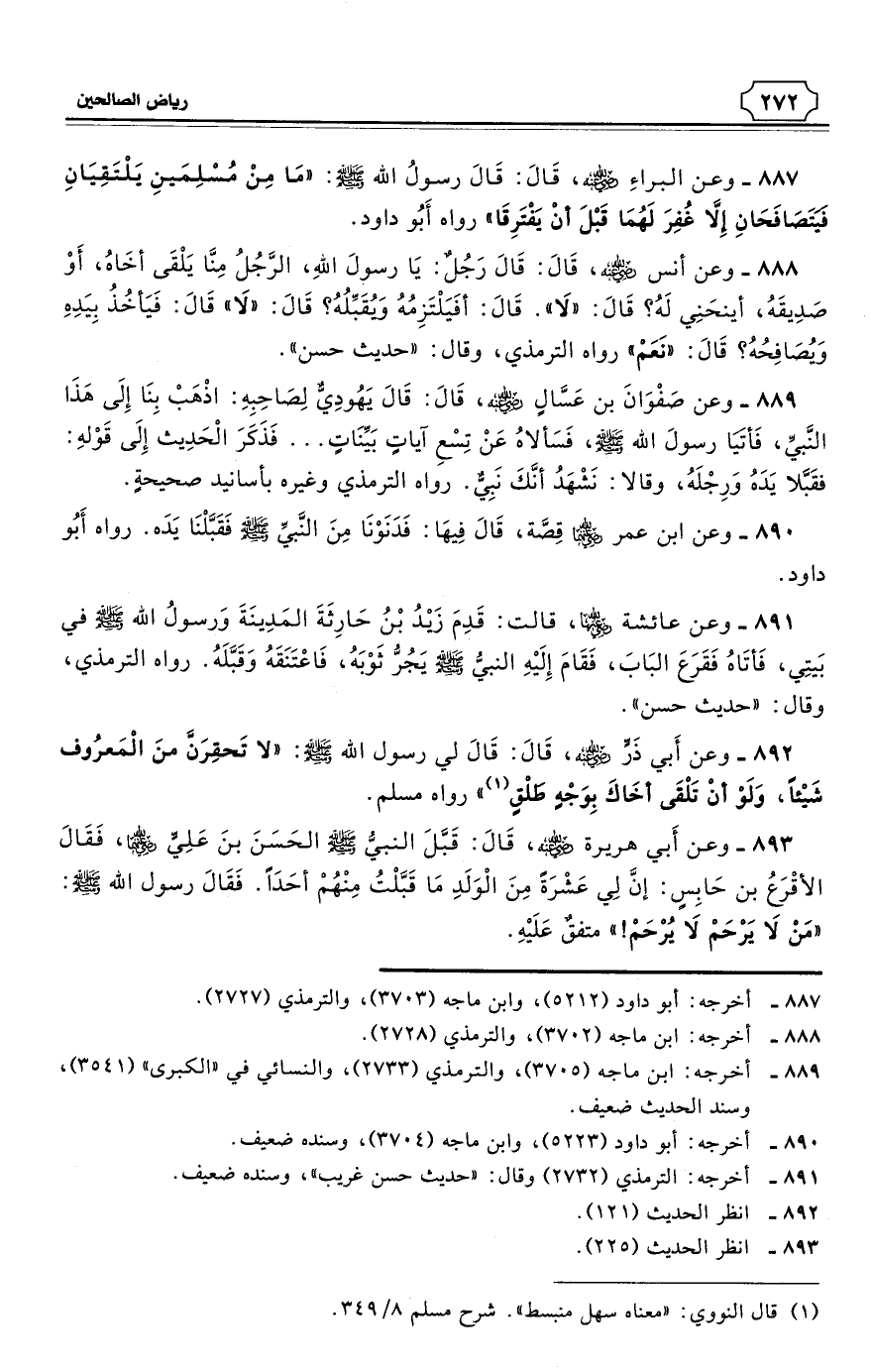 888 - وعن أنس - رضي الله عنه - قَالَ: قَالَ رَجُلٌ: يَا رسولَ اللهِ، الرَّجُلُ مِنَّا يَلْقَى أخَاهُ، أَوْ صَدِيقَهُ، أينحَنِي لَهُ؟ قَالَ: «لاَ». قَالَ: أفَيَلْتَزِمُهُ وَيُقَبِّلُهُ؟ قَالَ: «لاَ» قَالَ: فَيَأخُذُ بِيَدِهِ وَيُصَافِحُهُ؟ قَالَ: «نَعَمْ». رواه الترمذي، (¬1) وقال: «حديث حسن».