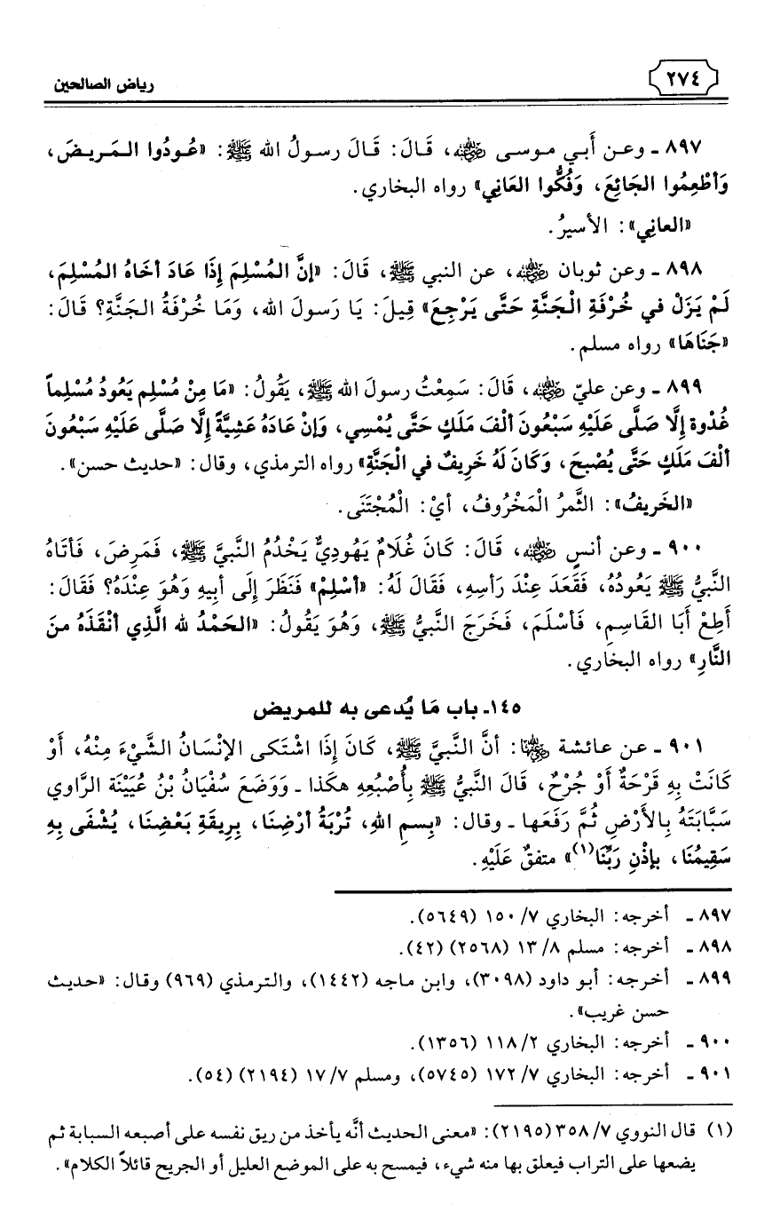 898 - وعن ثوبان - رضي الله عنه - عن النبي - صلى الله عليه وسلم - قَالَ: «إنَّ المُسْلِمَ إِذَا عَادَ أخَاهُ المُسْلِمَ، لَمْ يَزَلْ في خُرْفَةِ الْجَنَّةِ حَتَّى يَرْجِعَ» قِيلَ: يَا رَسولَ الله، وَمَا خُرْفَةُ الجَنَّةِ؟ قَالَ: «جَنَاهَا». رواه مسلم. (¬1)