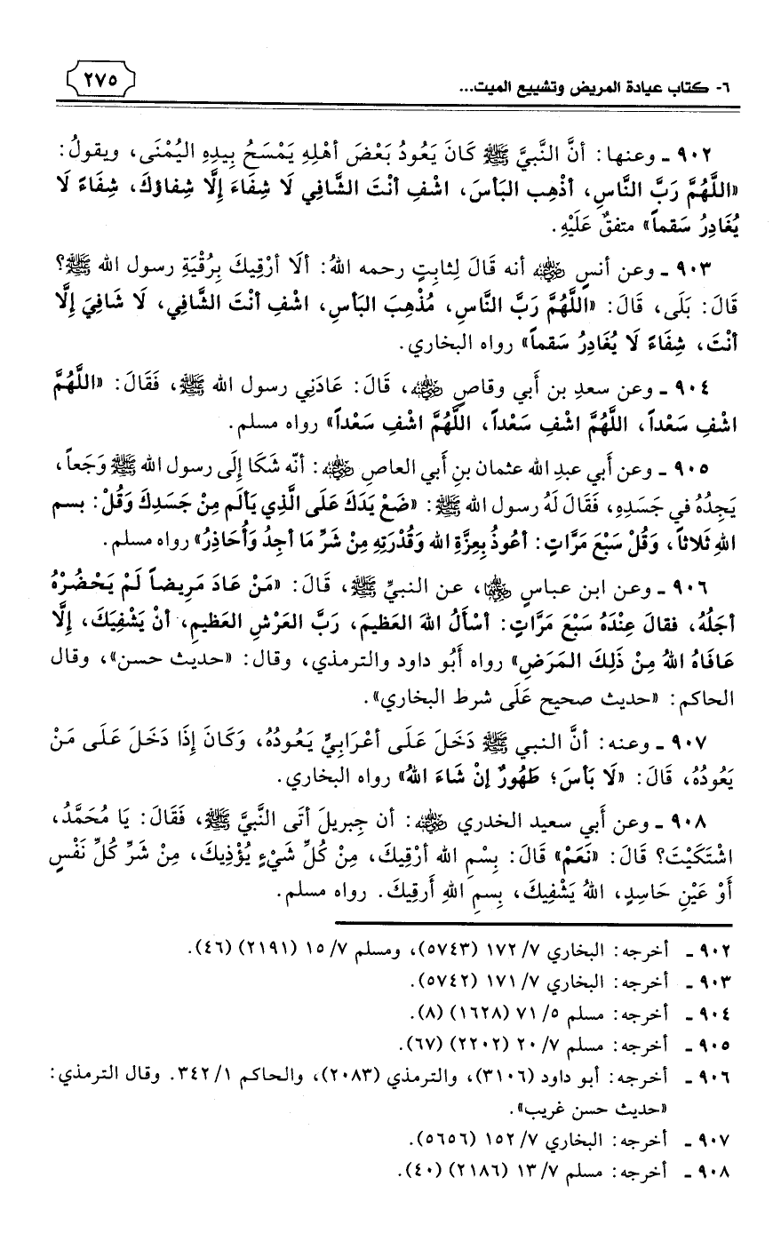902 - وعنها: أنَّ النَّبيَّ - صلى الله عليه وسلم - كَانَ يَعُودُ بَعْضَ أهْلِهِ يَمْسَحُ بِيدِهِ اليُمْنَى، ويقولُ: «اللَّهُمَّ رَبَّ النَّاسِ، أَذْهِب البَأْسَ، اشْفِ أنْتَ الشَّافِي، لاَ شِفَاءَ إِلاَّ شِفاؤكَ، شِفَاءً لاَ يُغَادِرُ سَقمًا». متفقٌ عَلَيْهِ. (¬1)
