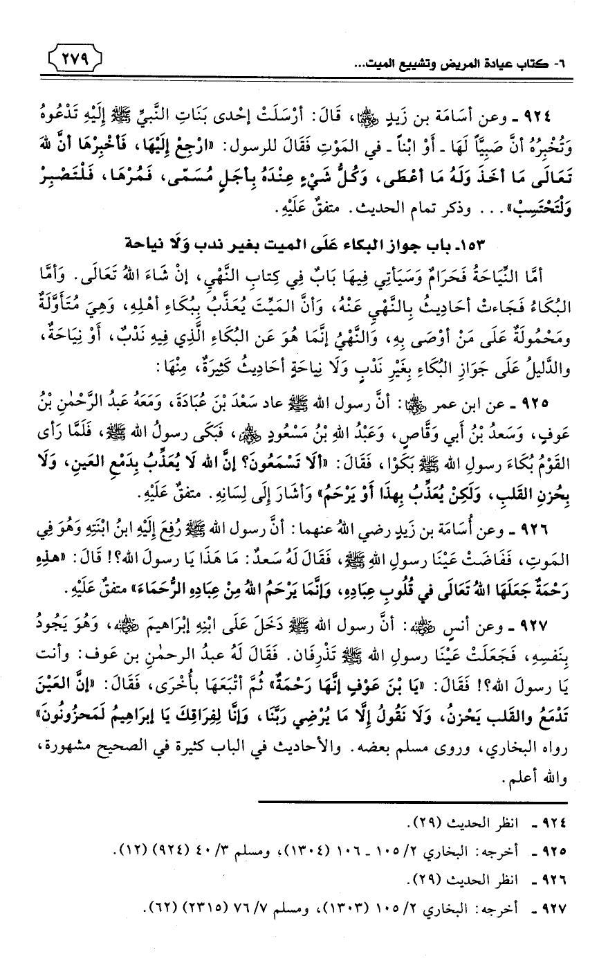 أمَّا النِّيَاحَةُ فَحَرَامٌ، وَسَيَأتِي فِيهَا بَابٌ فِي كِتابِ النَّهْيِ، إنْ شَاءَ اللهُ تَعَالَى. وَأمَّا البُكَاءُ فَجَاءتْ أحَادِيثُ بِالنَّهْيِ عَنْهُ، وَأنَّ المَيِّتَ يُعَذَّبُ بِبُكَاءِ أهْلِهِ، وَهِيَ مُتَأَوَّلَةٌ ومَحْمُولَةٌ عَلَى مَنْ أوْصَى بِهِ، وَالنَّهْيُ إنَّمَا هُوَ عَن البُكَاءِ الَّذِي فِيهِ نَدْبٌ، أَوْ نِيَاحَةٌ، والدَّليلُ عَلَى جَوَازِ البُكَاءِ بِغَيْرِ نَدْبٍ وَلاَ نِياحَةٍ أحَادِيثُ كَثِيرَةٌ، مِنْهَا: