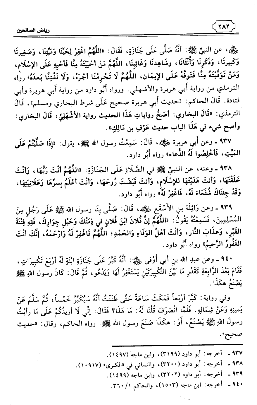 936 - وعن أَبي هريرة وأبي قتادة وَأبي إبراهيم الأشهلي، عن أبيه - وأبوه صَحَابيٌّ - رضي الله عنهم -[282]- عن النبيِّ - صلى الله عليه وسلم: أنَّهُ صَلَّى عَلَى جَنَازَةٍ، فَقَالَ: «اللَّهُمَّ اغْفِرْ لِحَيِّنَا وَمَيِّتِنَا، وَصَغِيرنَا وَكَبيرنَا، وَذَكَرِنَا وَأُنْثَانَا، وشَاهِدِنَا وَغَائِبِنَا، اللَّهُمَّ مَنْ أَحْيَيْتَهُ مِنَّا فَأَحْيِهِ عَلَى الإسْلاَمِ، وَمَنْ تَوَفَّيْتَهُ مِنَّا فَتَوفَّهُ عَلَى الإيمَان، اللَّهُمَّ لاَ تَحْرِمْنَا أَجْرَهُ، وَلاَ تَفْتِنَّا بَعدَهُ». رواه الترمذي من رواية أَبي هريرة والأشهلي. ورواه أَبُو داود من رواية أَبي هريرة وأبي قتادة. قَالَ الحاكم: «حديث أَبي هريرة صحيح عَلَى شرط البخاري ومسلم»، قَالَ الترمذي: «قَالَ البخاري: أصَحُّ رواياتِ هَذَا الحديث رواية الأشْهَلِيِّ، قَالَ البخاري: وأصح شيء في هَذَا الباب حديث عَوْفِ ابن مَالِكٍ». (¬1)