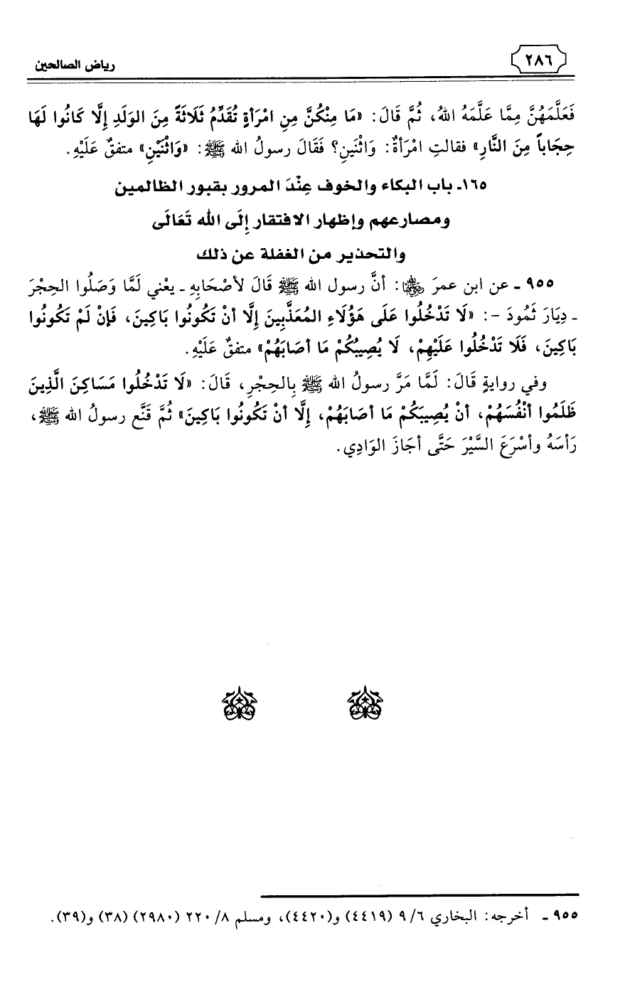 955 - عن ابن عمرَ رضي الله عنهما: أنَّ رسول الله - صلى الله عليه وسلم - قَالَ لأصْحَابِهِ - يعْني لَمَّا وَصَلُوا الحِجْرَ - دِيَارَ ثَمُودَ -: «لاَ تَدْخُلُوا عَلَى هَؤُلاَءِ المُعَذَّبِينَ إِلاَّ أَنْ تَكُونُوا بَاكِينَ، فَإنْ لَمْ تَكُونُوا بَاكِينَ، فَلاَ تَدْخُلُوا عَلَيْهِمْ، لاَ يُصِيبُكُمْ مَا أصَابَهُمْ». متفقٌ عَلَيْهِ. (¬1)