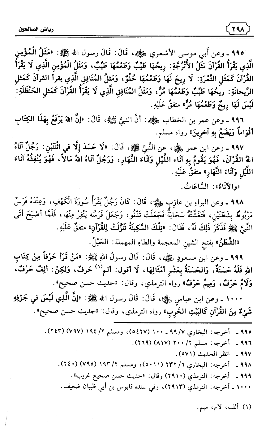 999 - وعن ابن مسعودٍ - رضي الله عنه - قَالَ: قَالَ رسولُ اللهِ - صلى الله عليه وسلم: «مَنْ قَرَأ حَرْفًا مِنْ كِتَابِ اللهِ فَلَهُ حَسَنَةٌ، وَالحَسَنَةُ بِعَشْرِ أمْثَالِهَا، لاَ أقول: ألم (¬1) حَرفٌ، وَلكِنْ: ألِفٌ حَرْفٌ، وَلاَمٌ حَرْفٌ، وَمِيمٌ حَرْفٌ». رواه الترمذي، (¬2) وقال: «حديث حسن صحيح».