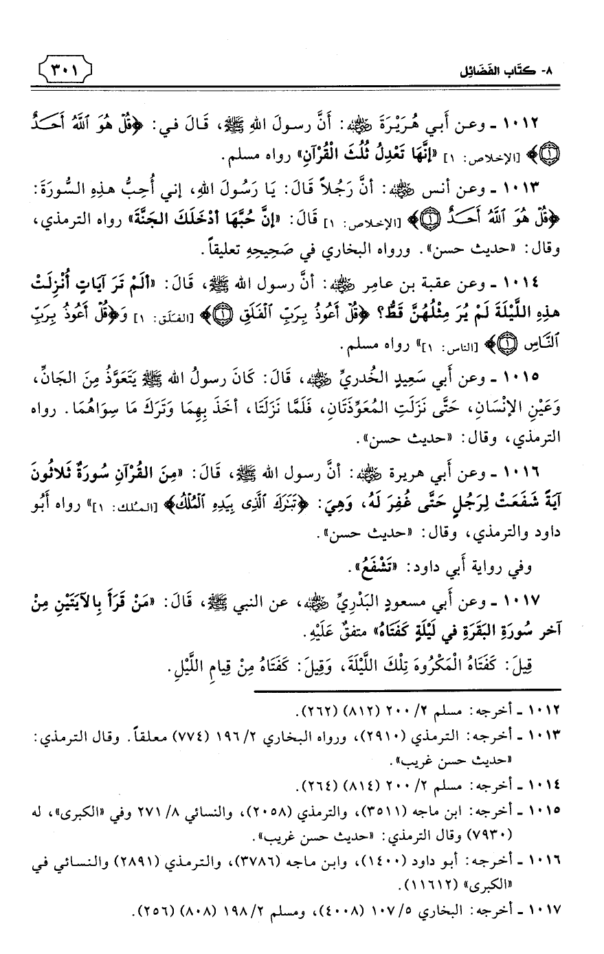 1012 - وعن أَبي هُرَيْرَةَ - رضي الله عنه: أَنَّ رسولَ اللهِ - صلى الله عليه وسلم - قَالَ في: {قُلْ هُوَ اللهُ أَحَدٌ} «إنَّهَا تَعْدِلُ ثُلُثَ الْقُرْآنِ». رواه مسلم. (¬1)