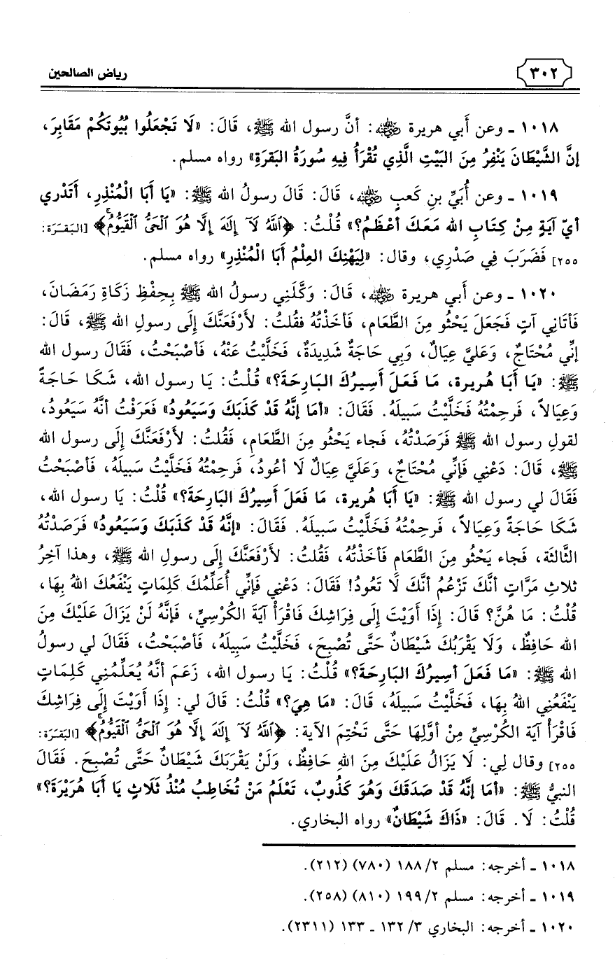 1020 - وعن أَبي هريرة - رضي الله عنه - قَالَ: وَكَّلَنِي رسولُ الله - صلى الله عليه وسلم - بِحِفْظِ زَكَاةِ رَمَضَانَ، فَأتَانِي آتٍ فَجَعَلَ يَحْثُو مِنَ الطَّعَام، فَأخَذْتُهُ فقُلتُ: لأَرْفَعَنَّكَ إِلَى رسولِ الله - صلى الله عليه وسلم - قَالَ: إنِّي مُحْتَاجٌ، وَعَليَّ عِيَالٌ، وَبِي حَاجَةٌ شَدِيدَةٌ، فَخَلَّيْتُ عَنْهُ، فَأصْبَحْتُ، فَقَالَ رسول الله - صلى الله عليه وسلم: «يَا أَبَا هُريرة، مَا فَعَلَ أَسِيرُكَ البَارِحَةَ؟» قُلْتُ: يَا رسول الله، شَكَا حَاجَةً وَعِيَالًا، فَرحِمْتُهُ فَخَلَّيْتُ سَبيلَهُ. فَقَالَ: «أمَا إنَّهُ قَدْ كَذَبَكَ وَسَيَعُودُ» فَعَرَفْتُ أنَّهُ سَيَعُودُ، لقولِ رسول الله - صلى الله عليه وسلم - فَرَصَدْتُهُ، فَجاء يَحْثُو مِنَ الطَّعَامِ، فَقُلتُ: لأَرْفَعَنَّكَ إِلَى رسول الله - صلى الله عليه وسلم - قَالَ: دَعْنِي فَإنِّي مُحْتَاجٌ، وَعَلَيَّ عِيَالٌ لاَ أعُودُ، فَرحِمْتُهُ فَخَلَّيْتُ سَبيلَهُ، فَأصْبَحْتُ فَقَالَ لي رسول الله - صلى الله عليه وسلم: «يَا أَبَا هُريرة، مَا فَعَلَ أَسِيرُكَ البَارِحَةَ؟» قُلْتُ: يَا رسول الله، شَكَا حَاجَةً وَعِيَالًا، فَرحِمْتُهُ فَخَلَّيْتُ سَبيلَهُ. فَقَالَ: «إنَّهُ قَدْ كَذَبَكَ وَسَيَعُودُ» فَرَصَدْتُهُ الثَّالثَة، فَجاء يَحْثُو مِنَ الطَّعَامِ فَأخَذْتُهُ، فَقُلتُ: لأَرْفَعَنَّكَ إِلَى رسولِ الله - صلى الله عليه وسلم - وهذا آخِرُ ثلاثِ مَرَّاتٍ أنَّكَ تَزْعُمُ أنَّكَ لاَ تَعُودُ! فَقَالَ: دَعْنِي فَإنِّي أُعَلِّمُكَ كَلِمَاتٍ يَنْفَعُكَ اللهُ بِهَا، قُلْتُ: مَا هُنَّ؟ قَالَ: إِذَا أَوَيْتَ إِلَى فِرَاشِكَ فَاقْرَأْ آيَةَ الكُرْسِيِّ، فَإنَّهُ لَنْ يَزَالَ عَلَيْكَ مِنَ الله حَافِظٌ، وَلاَ يَقْرَبُكَ شَيْطَانٌ حَتَّى تُصْبِحَ، فَخَلَّيْتُ سَبِيلَهُ، فَأصْبَحْتُ، فَقَالَ لي رسولُ الله - صلى الله عليه وسلم: «مَا فَعَلَ أسِيرُكَ البَارِحَةَ؟» قُلْتُ: يَا رسول الله، زَعَمَ أنَّهُ يُعَلِّمُنِي كَلِمَاتٍ يَنْفَعُنِي اللهُ بِهَا، فَخَلَّيْتُ سَبيلَهُ، قَالَ: «مَا هِيَ؟» قُلْتُ: قَالَ لي: إِذَا أَوَيْتَ إِلَى فِرَاشِكَ فَاقْرَأْ آيَة الكُرْسِيِّ مِنْ أوَّلِهَا حَتَّى تَخْتِمَ الآية: {اللهُ لاَ إلَهَ إِلاَّ هُوَ الحَيُّ القَيُّومُ} وقال لِي: لاَ يَزَالُ عَلَيْكَ مِنَ اللهِ حَافِظٌ، وَلَنْ يَقْرَبَكَ شَيْطَانٌ حَتَّى تُصْبِحَ. فَقَالَ النبيُّ - صلى الله عليه وسلم: «أمَا إنَّهُ قَدْ صَدَقَكَ وَهُوَ كَذُوبٌ، تَعْلَمُ مَنْ تُخَاطِبُ مُنْذُ ثَلاَثٍ يَا أَبَا هُرَيْرَةَ؟» قُلْتُ: لاَ. قَالَ: «ذَاكَ شَيْطَانٌ». رواه البخاري. (¬1)