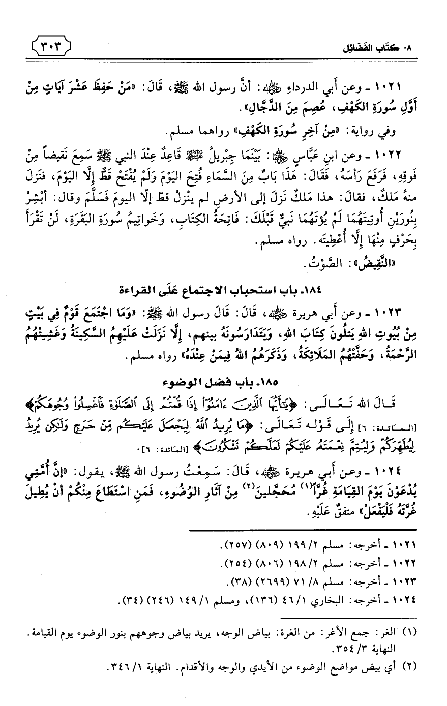 1022 - وعن ابنِ عَبَّاسٍ رضي الله عنهما: بَيْنَمَا جِبْريلُ - عليه السلام - قَاعِدٌ عِنْدَ النبي - صلى الله عليه وسلم - سَمِعَ نَقيضًا مِنْ فَوقِهِ، فَرَفَعَ رَأسَهُ، فَقَالَ: هَذَا بَابٌ مِنَ السَّمَاءِ فُتِحَ اليَوْمَ وَلَمْ يُفْتَحْ قَطٌّ إِلاَّ اليَوْمَ، فنَزلَ منهُ مَلكٌ، فقالَ: هذا مَلكٌ نَزلَ إلى الأرضِ لم ينْزلْ قطّ إلاّ اليومَ فَسَلَّمَ وقال: أبْشِرْ بِنُورَيْنِ أُوتِيتَهُمَا لَمْ يُؤتَهُمَا نَبيٌّ قَبْلَكَ: فَاتِحَةُ الكِتَابِ، وَخَواتِيمُ سُورَةِ البَقَرَةِ، لَنْ تَقْرَأَ بِحَرْفٍ مِنْهَا إِلاَّ أُعْطِيتَه. رواه مسلم. (¬1)