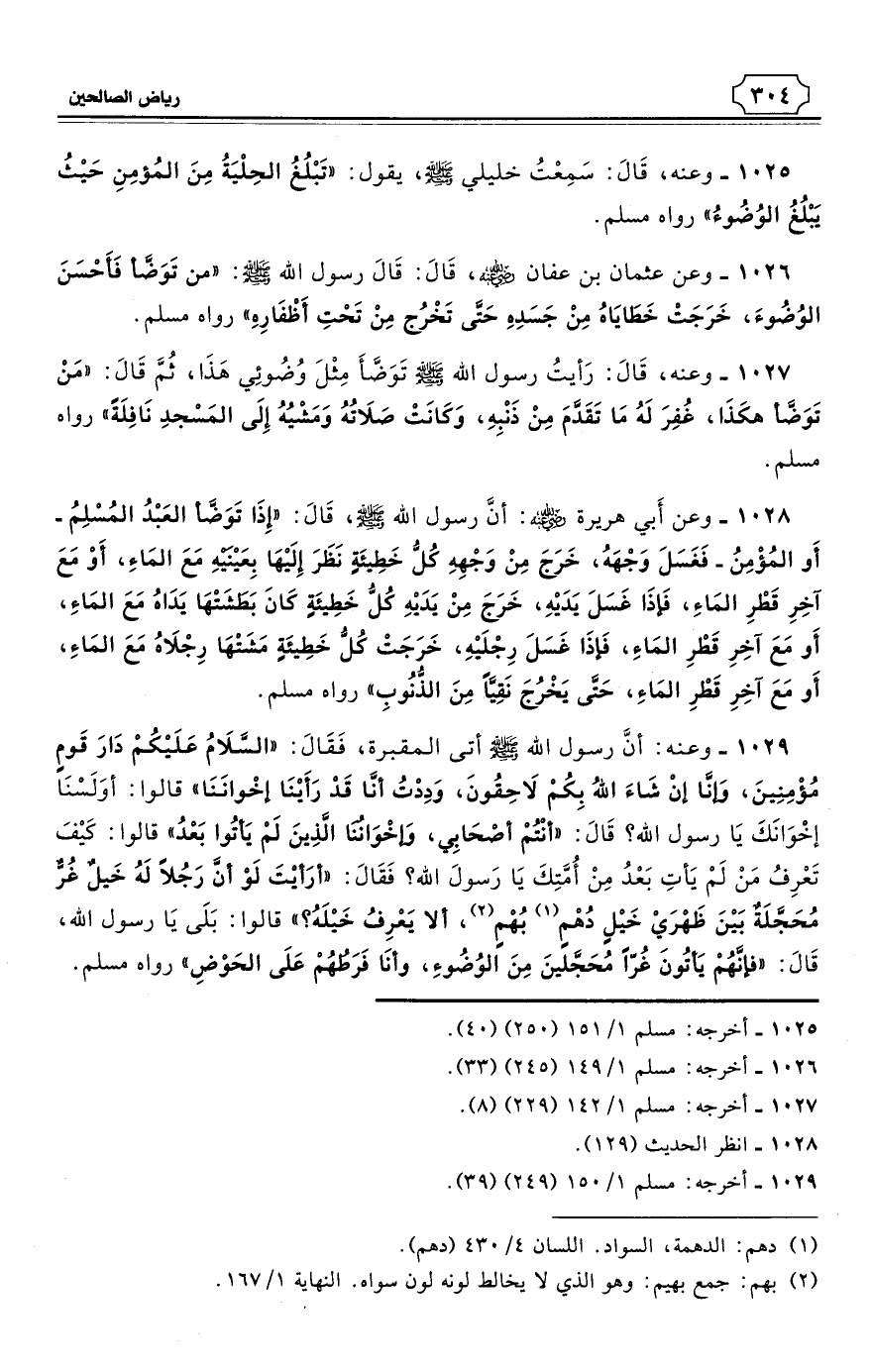1029 - وعنه: أنَّ رسول الله - صلى الله عليه وسلم - أتى المقبرة، فَقَالَ: «السَّلاَمُ عَلَيْكُمْ دَارَ قَومٍ مُؤْمِنِينَ، وَإنَّا إنْ شَاءَ اللهُ بِكُمْ لاَحِقُونَ، وَدِدْتُ أنَّا قَدْ رَأَيْنَا إخْوانَنَا» قالوا: أوَلَسْنَا إخْوَانَكَ يَا رسول الله؟ قَالَ: «أنْتُمْ أصْحَابِي، وَإخْوَانُنَا الَّذِينَ لَمْ يَأتُوا بَعْدُ» قالوا: كَيْفَ تَعْرِفُ مَنْ لَمْ يَأتِ بَعْدُ مِنْ أُمَّتِكَ يَا رَسولَ الله؟ فَقَالَ: «أرَأيْتَ لَوْ أنَّ رَجُلًا لَهُ خَيلٌ غُرٌّ مُحَجَّلَةٌ بَيْنَ ظَهْرَيْ خَيْلٍ دُهْمٍ (¬1) بُهْمٍ (¬2)، ألا يَعْرِفُ خَيْلَهُ؟» قالوا: بَلَى يَا رسول الله، قَالَ: «فإنَّهُمْ يَأتُونَ غُرًّا مُحَجَّلينَ مِنَ الوُضُوءِ، وأنَا فَرَطُهُمْ عَلَى الحَوْضِ». رواه مسلم. (¬3)