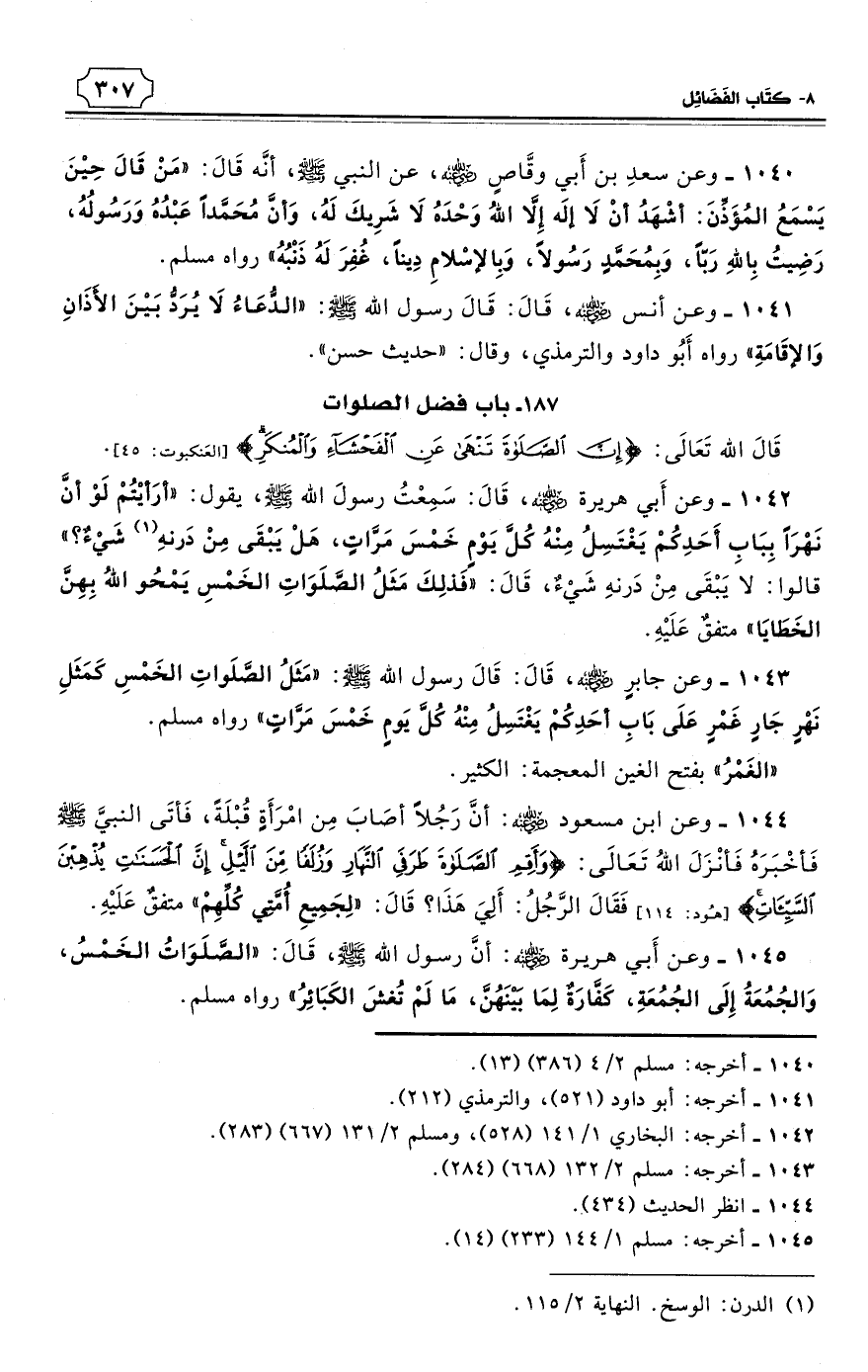1040 - وعن سعدِ بن أَبي وقَّاصٍ - رضي الله عنه - عن النبي - صلى الله عليه وسلم - أنَّه قَالَ: «مَنْ قَالَ حِيْنَ يَسْمَعُ المُؤَذِّنَ: أشْهَدُ أَنْ لاَ إلَه إِلاَّ اللهُ وَحْدَهُ لاَ شَرِيكَ لَهُ، وَأنَّ مُحَمَّدًا عَبْدُهُ وَرَسُولُهُ، رَضِيتُ بِاللهِ رَبًّا، وَبِمُحَمَّدٍ رَسُولًا، وَبِالإسْلامِ دِينًا، غُفِرَ لَهُ ذَنْبُهُ». رواه مسلم. (¬1)