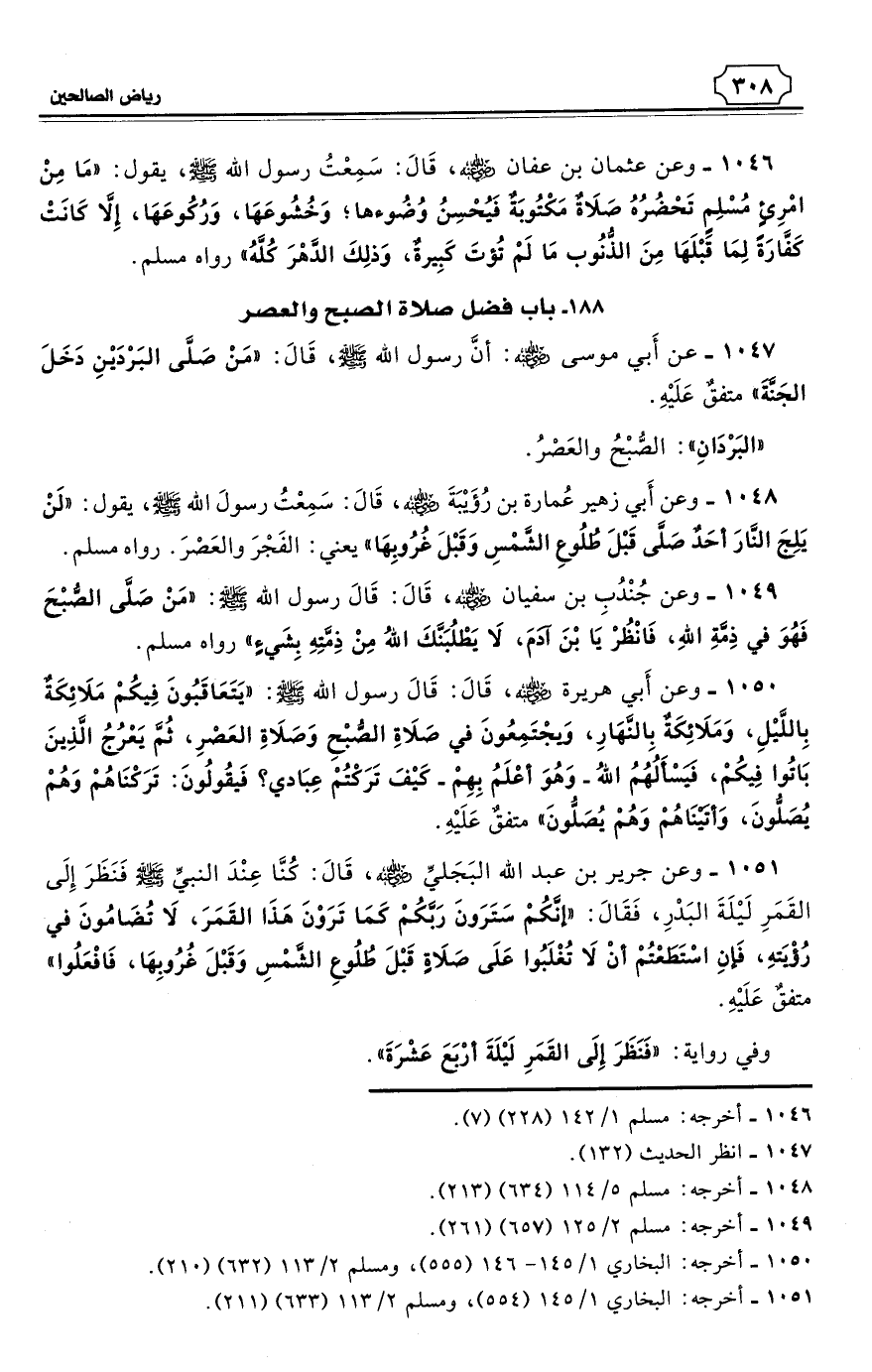 1051 - وعن جرير بن عبد الله البَجَليِّ - رضي الله عنه - قَالَ: كُنَّا عِنْدَ النبيِّ - صلى الله عليه وسلم - فَنَظَرَ إِلَى القَمَرِ لَيْلَةَ البَدْرِ، فَقَالَ: «إنَّكُمْ سَتَرَونَ رَبَّكُمْ كَمَا تَرَوْنَ هَذَا القَمَرَ، لاَ تُضَامُونَ في رُؤْيَتهِ، فَإنِ اسْتَطَعْتُمْ أَنْ لاَ تُغْلَبُوا عَلَى صَلاَةٍ قَبْلَ طُلُوعِ الشَّمْسِ وَقَبْلَ غُرُوبِهَا، فَافْعَلُوا». متفقٌ عَلَيْهِ. (¬1)