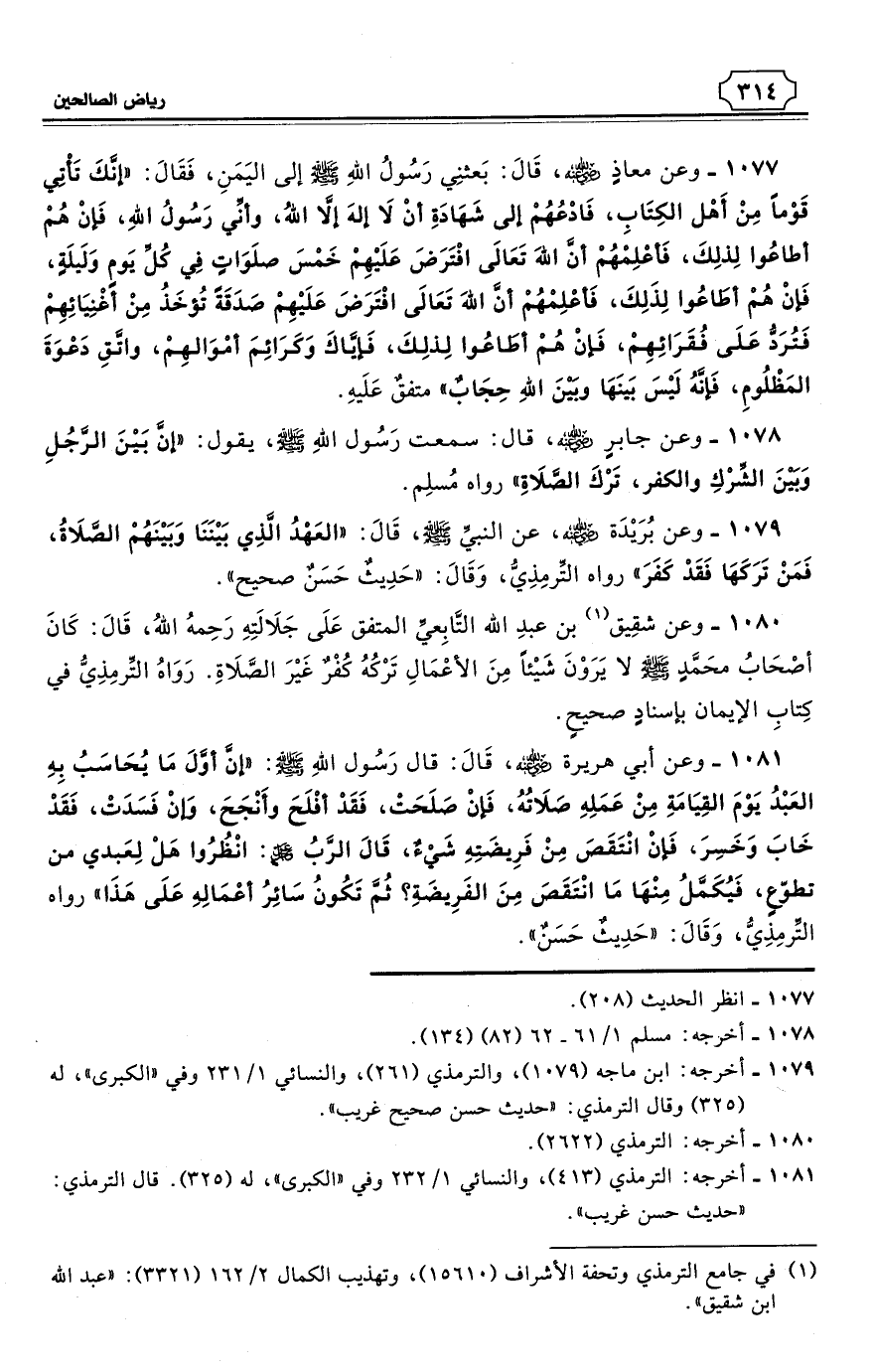 1080 - وعن شقِيق (¬1) بن عبدِ الله التَّابِعيِّ المتفق عَلَى جَلاَلَتِهِ رَحِمهُ اللهُ، قَالَ: كَانَ أصْحَابُ محَمَّدٍ - صلى الله عليه وسلم - لا يَرَوْنَ شَيْئًا مِنَ الأعْمَالِ تَرْكُهُ كُفْرٌ غَيْرَ الصَّلاَةِ. رَوَاهُ التِّرمِذِيُّ في كِتابِ الإيمان بإسنادٍ صحيحٍ. (¬2)