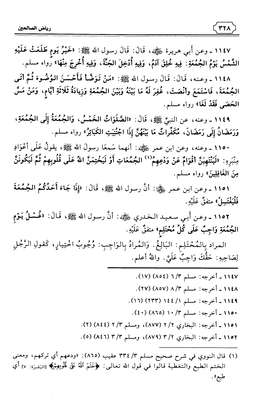 1147 - وعن أَبي هريرة - رضي الله عنه - قَالَ: قَالَ رسول الله - صلى الله عليه وسلم: «خَيْرُ يَومٍ طَلَعَتْ عَلَيْهِ الشَّمْسُ يَوْمُ الجُمُعَةِ: فِيهِ خُلِقَ آدَمُ، وَفِيهِ أُدْخِلَ الجَنَّةَ، وَفِيهِ أُخْرِجَ مِنْهَا». رواه مسلم. (¬1)