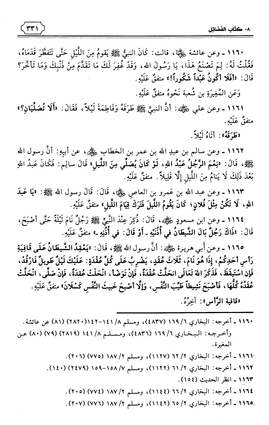 1160 - وعن عائشة رضي الله عنها، قالت: كَانَ النبيُّ - صلى الله عليه وسلم - يَقومُ مِنَ اللَّيْلِ حَتَّى تَتَفطَّرَ قَدَمَاهُ، فَقُلْتُ لَهُ: لِمَ تَصْنَعُ هَذَا، يَا رَسُولَ الله، وَقَدْ غُفِرَ لَكَ مَا تَقَدَّمَ مِنْ ذَنْبِكَ وَمَا تَأخَّرَ؟ قَالَ: «أفَلاَ أكُونُ عَبْدًا شَكُورًا!». متفقٌ عَلَيْهِ. (¬1)