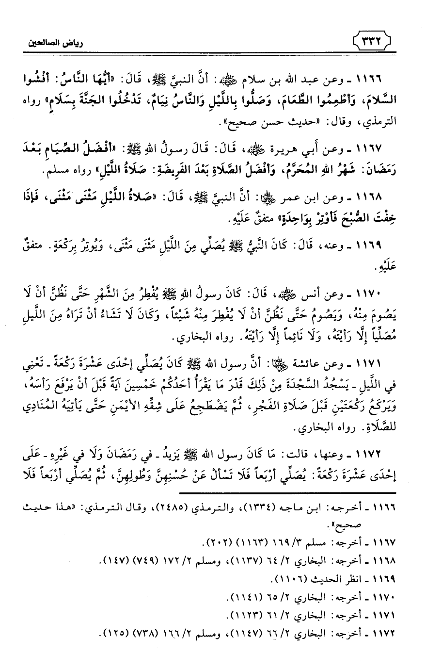 1166 - وعن عبد الله بن سلام - رضي الله عنه: أنَّ النبيَّ - صلى الله عليه وسلم - قَالَ: «أيُّهَا النَّاسُ: أفْشُوا السَّلامَ، وَأطْعِمُوا الطَّعَامَ، وَصَلُّوا بِاللَّيْلِ وَالنَّاسُ نِيَامٌ، تَدْخُلُوا الجَنَّةَ بِسَلاَمٍ». رواه الترمذي، (¬1) وقال: «حديث حسن صحيح».