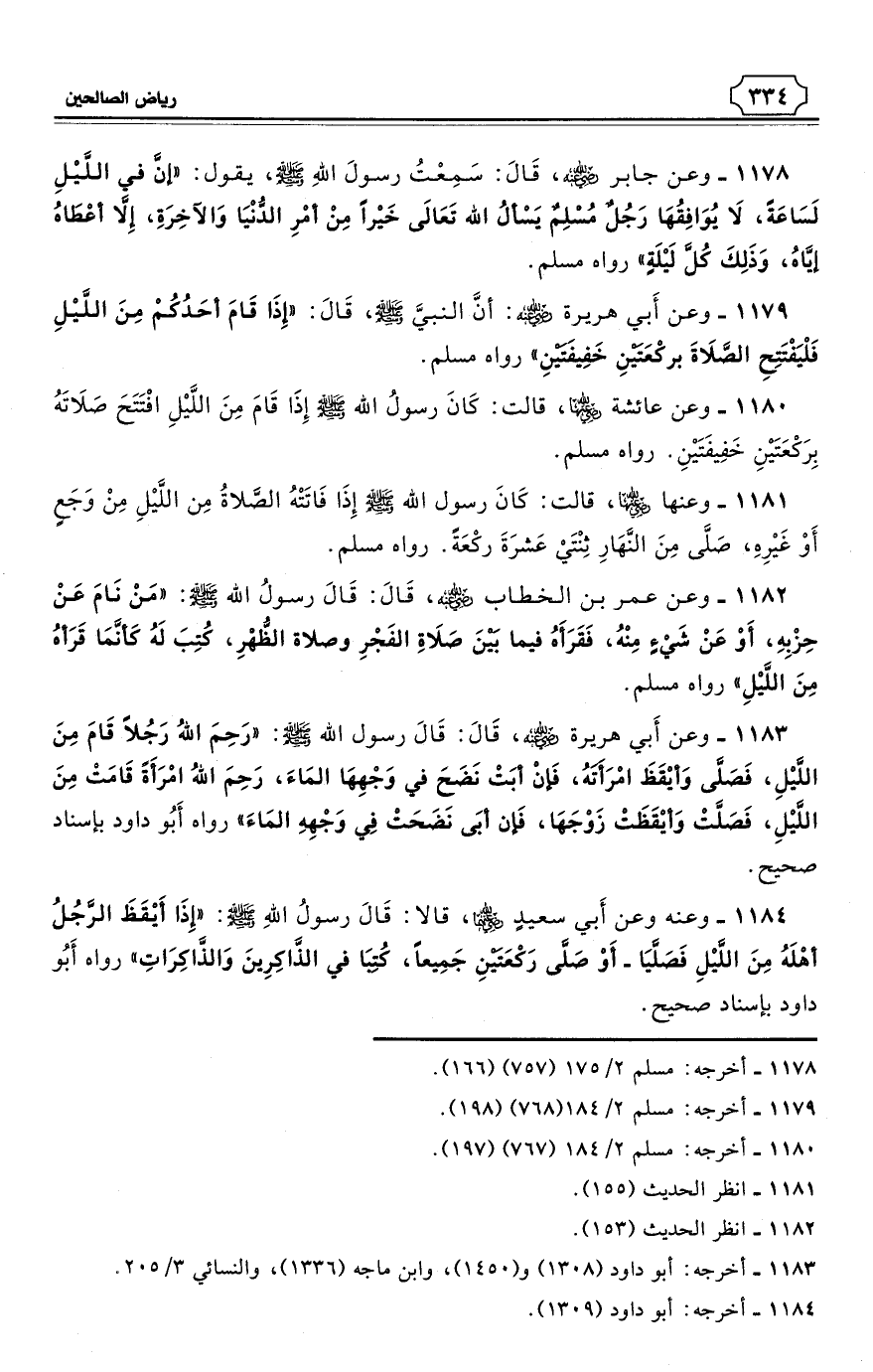 1183 - وعن أَبي هريرة - رضي الله عنه - قَالَ: قَالَ رسول الله - صلى الله عليه وسلم: «رَحِمَ اللهُ رَجُلًا قَامَ مِنَ اللَّيْلِ، فَصَلَّى وَأيْقَظَ امْرَأَتَهُ، فَإنْ أبَتْ نَضَحَ في وَجْهِهَا المَاءَ، رَحِمَ اللهُ امْرَأَةً قَامَتْ مِنَ اللَّيْلِ، فَصَلَّتْ وَأيْقَظَتْ زَوْجَهَا، فَإن أبَى نَضَحَتْ فِي وَجْهِهِ المَاءَ». رواه أَبُو داود بإسناد صحيح. (¬1)