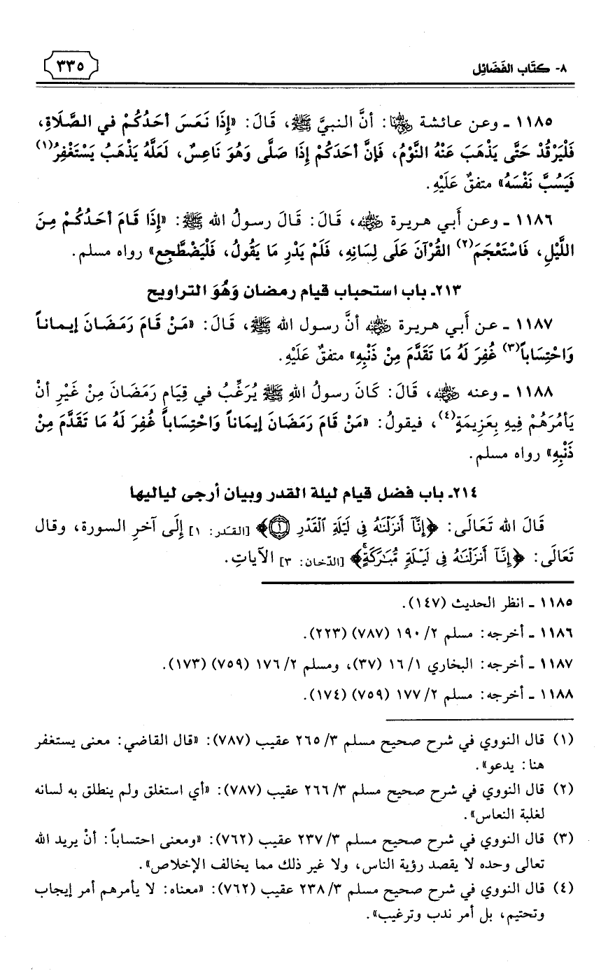 1187 - عن أَبي هريرة - رضي الله عنه - أنَّ رسول الله - صلى الله عليه وسلم - قَالَ: «مَنْ قَامَ رَمَضَانَ إيمانًا وَاحْتِسَابًا (¬1) غُفِرَ لَهُ مَا تَقَدَّمَ مِنْ ذَنْبِهِ». متفقٌ عَلَيْهِ. (¬2)