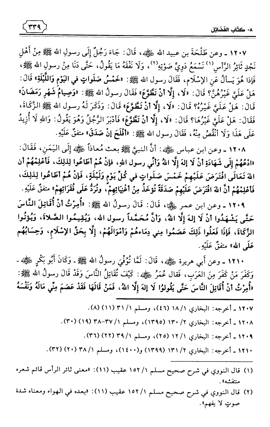 1207 - وعن طَلْحَةَ بن عبيد الله - رضي الله عنه - قَالَ: جَاءَ رَجُلٌ إِلَى رسولِ الله - صلى الله عليه وسلم - مِنْ أَهْلِ نَجْدٍ ثَائِرُ الرَّأسِ (¬1) نَسْمَعُ دَوِيَّ صَوْتِهِ (¬2)، وَلاَ نَفْقَهُ مَا يَقُولُ، حَتَّى دَنَا مِنْ رسولِ الله - صلى الله عليه وسلم - فَإذا هُوَ يَسألُ عَنِ الإسْلاَم، فَقَالَ رسول الله - صلى الله عليه وسلم: «خَمْسُ صَلَواتٍ فِي اليَوْمِ وَاللَّيْلَةِ» قَالَ: هَلْ عَلَيَّ غَيْرُهُنَّ؟ قَالَ: «لاَ، إِلاَّ أَنْ تَطَّوَّعَ» فَقَالَ رسولُ الله - صلى الله عليه وسلم: «وَصِيامُ شَهْرِ رَمَضَانَ» قَالَ: هَلْ عَلَيَّ غَيْرُهُ؟ قَالَ: «لاَ، إِلاَّ أَنْ تَطَّوَّعَ» قَالَ: وَذَكَرَ لَهُ رسول الله - صلى الله عليه وسلم - الزَّكَاةَ، فَقَالَ: هَلْ عَلَيَّ غَيْرُهَا؟ قَالَ: «لاَ، إِلاَّ أَنْ تَطَّوَّعَ» فَأدْبَرَ الرَّجُلُ وَهُوَ يَقُولُ: وَاللهِ لاَ أُزِيدُ عَلَى هَذَا وَلاَ أنْقُصُ مِنْهُ، فَقَالَ رسول الله - صلى الله عليه وسلم: «أفْلَحَ إنْ صَدَقَ». متفقٌ عَلَيْهِ. (¬3)