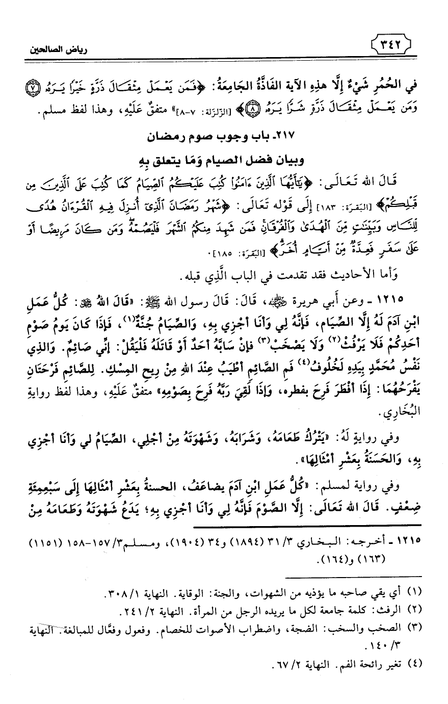 1215 - وعن أَبي هريرة - رضي الله عنه - قَالَ: قَالَ رسول الله - صلى الله عليه وسلم: «قَالَ اللهُ - عز وجل: كُلُّ عَمَلِ ابْنِ آدَمَ لَهُ إِلاَّ الصِّيَام، فَإنَّهُ لِي وَأنَا أجْزِي بِهِ، وَالصِّيَامُ جُنَّةٌ (¬1)، فَإذَا كَانَ يَومُ صَوْمِ أحَدِكُمْ فَلاَ يَرْفُثْ (¬2) وَلاَ يَصْخَبْ (¬3) فإنْ سَابَّهُ أحَدٌ أَوْ قَاتَلَهُ فَلْيَقُلْ: إنِّي صَائِمٌ. وَالذِي نَفْسُ مُحَمَّدٍ بِيَدِهِ لَخُلُوفُ (¬4) فَمِ الصَّائِمِ أطْيَبُ عِنْدَ اللهِ مِنْ رِيحِ المِسْكِ. لِلصَّائِمِ فَرْحَتَانِ يَفْرَحُهُمَا: إِذَا أفْطَرَ فَرِحَ بفطره، وَإذَا لَقِيَ رَبَّهُ فَرِحَ بِصَوْمِهِ». متفقٌ عَلَيْهِ، وهذا لفظ روايةِ البُخَارِي. (¬5)