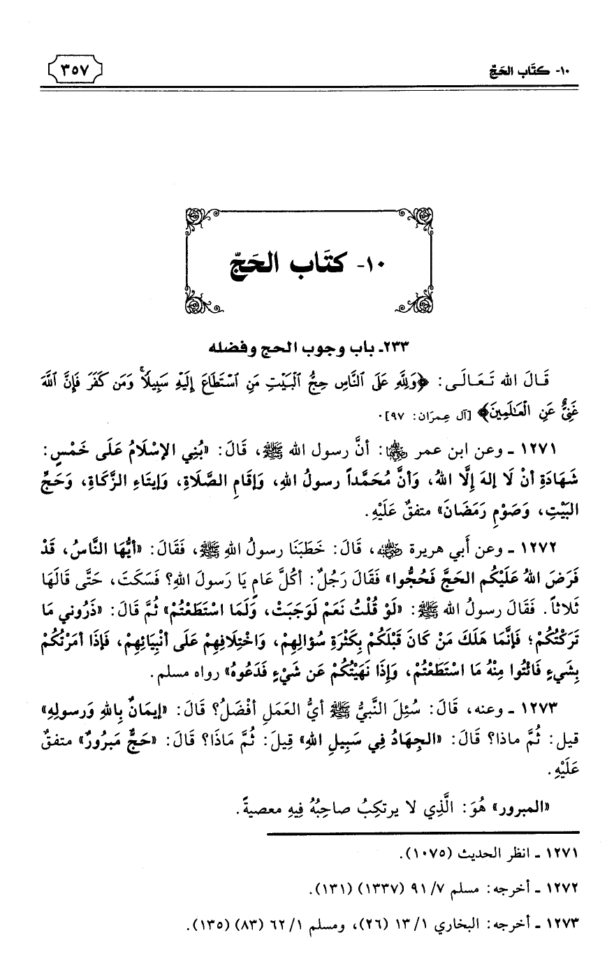 1272 - وعن أَبي هريرة - رضي الله عنه - قَالَ: خَطَبَنَا رسولُ اللهِ - صلى الله عليه وسلم - فَقَالَ: «أيُّهَا النَّاسُ، قَدْ فَرَضَ اللهُ عَلَيْكُم الحَجَّ فَحُجُّوا» فَقَالَ رَجُلٌ: أكُلَّ عَامٍ يَا رَسولَ اللهِ؟ فَسَكَتَ، حَتَّى قَالَهَا ثَلاثًا. فَقَالَ رسولُ الله - صلى الله عليه وسلم: «لَوْ قُلْتُ نَعَمْ لَوَجَبَتْ، وَلَمَا اسْتَطَعْتُمْ» ثُمَّ قَالَ: «ذَرُوني مَا تَرَكْتُكُمْ؛ فَإنَّمَا هَلَكَ مَنْ كَانَ قَبْلَكُمْ بِكَثْرَةِ سُؤالِهِمْ، وَاخْتِلاَفِهِمْ عَلَى أنْبِيَائِهِمْ، فَإذَا أمَرْتُكُمْ بِشَيءٍ فَأتُوا مِنْهُ مَا اسْتَطَعْتُمْ، وَإِذَا نَهَيْتُكُمْ عَن شَيْءٍ فَدَعُوهُ». رواه مسلم. (¬1)