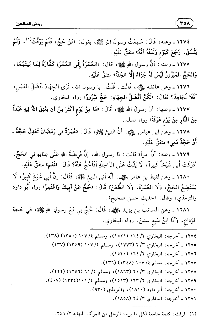 1274 - وعنه، قَالَ: سَمِعْتُ رسولَ اللهِ - صلى الله عليه وسلم - يقول: «مَنْ حَجَّ، فَلَمْ يَرْفُثْ (¬1)، وَلَمْ يَفْسُقْ، رَجَعَ كَيَوْمِ وَلَدَتْهُ أمُّهُ». متفقٌ عَلَيْهِ. (¬2)