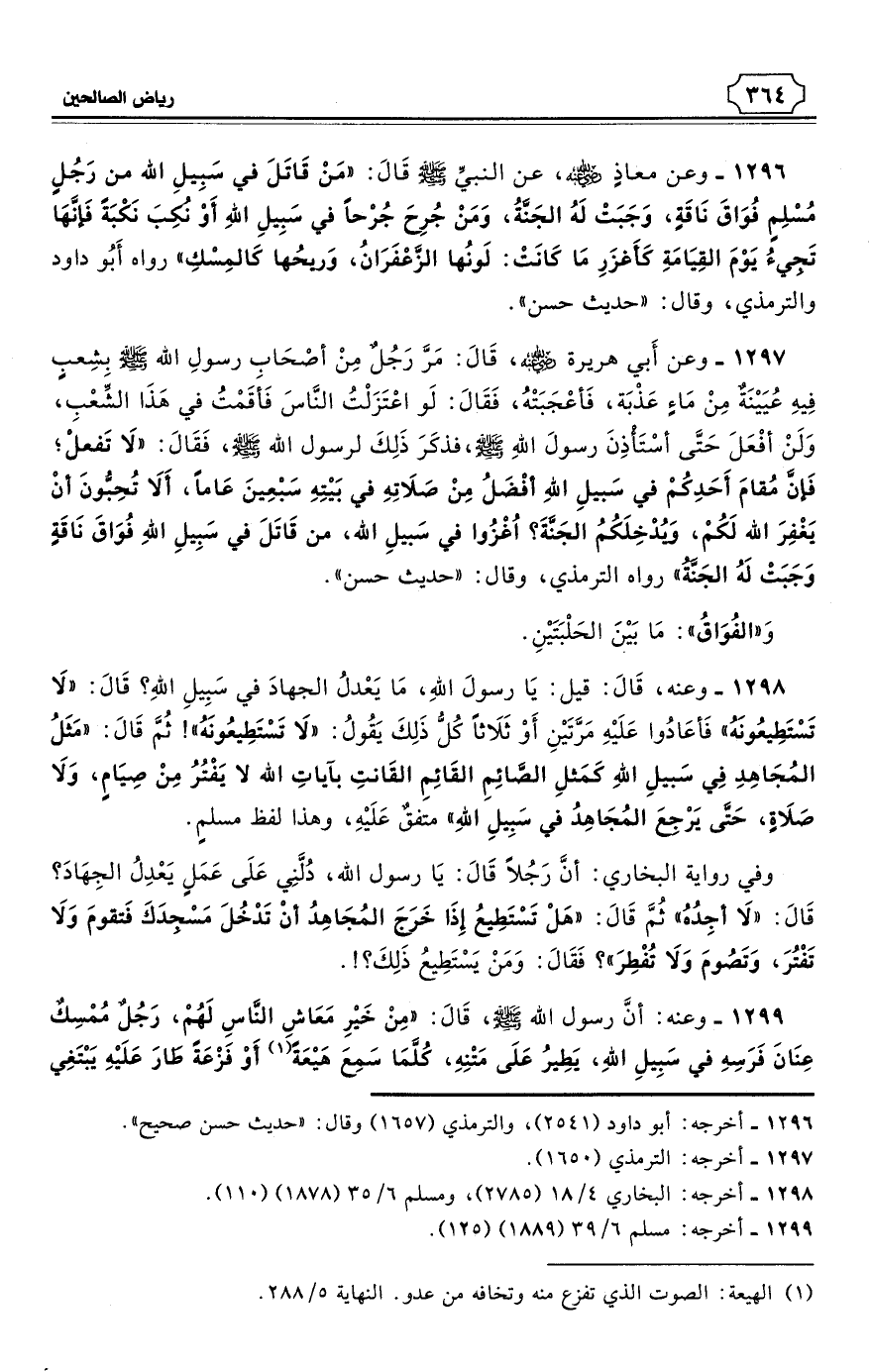 1296 - وعن معاذٍ - رضي الله عنه - عن النبيِّ - صلى الله عليه وسلم - قَالَ: «مَنْ قَاتَلَ في سَبِيلِ الله من رَجُلٍ مُسْلِمٍ فُوَاقَ نَاقَةٍ، وَجَبَتْ لَهُ الجَنَّةُ، وَمَنْ جُرِحَ جُرْحًا في سَبِيلِ اللهِ أَوْ نُكِبَ نَكْبَةً فَإنَّهَا تَجِيءُ يَوْمَ القِيَامَةِ كَأَغزَرِ مَا كَانَتْ: لَونُها الزَّعْفَرَانُ، وَريحُها كَالمِسْكِ». رواه أَبُو داود والترمذي، (¬1) وقال: «حديث حسن».
