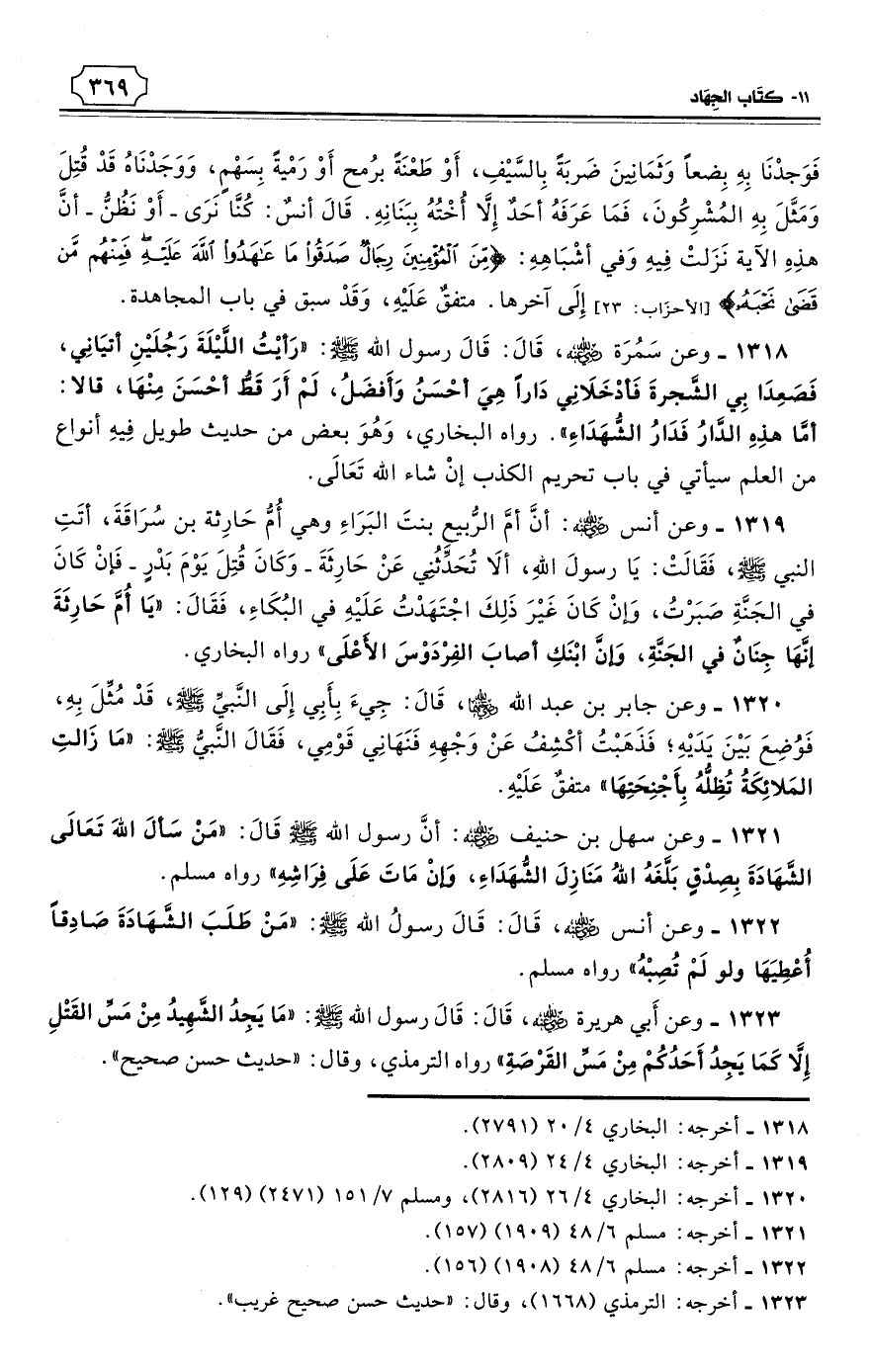 1319 - وعن أنس - رضي الله عنه: أنَّ أمَّ الرُّبيعِ بنتَ البَرَاءِ وهي أُمُّ حَارِثة بن سُرَاقَةَ، أتَتِ النبي - صلى الله عليه وسلم - فَقَالَتْ: يَا رسولَ اللهِ، ألاَ تُحَدِّثُنِي عَنْ حَارِثَةَ - وَكَانَ قُتِلَ يَوْمَ بَدْرٍ - فَإنْ كَانَ في الجَنَّةِ صَبَرْتُ، وَإنْ كَانَ غَيْرَ ذَلِكَ اجْتَهَدْتُ عَلَيْهِ في البُكَاءِ، فَقَالَ: «يَا أُمَّ حَارِثَةَ إنَّهَا جِنَانٌ في الجَنَّةِ، وَإنَّ ابْنَكِ أصابَ الفِرْدَوْسَ الأَعْلَى». رواه البخاري. (¬1)