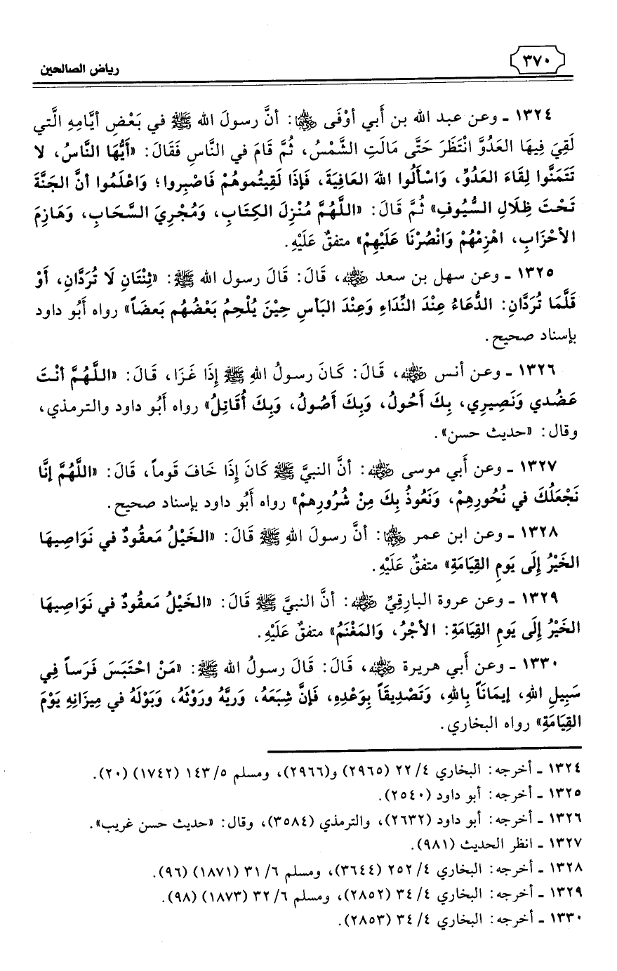 1324 - وعن عبد الله بن أَبي أوْفَى رضي الله عنهما: أنَّ رسولَ الله - صلى الله عليه وسلم - في بَعْضِ أيَّامِهِ الَّتي لَقِيَ فِيهَا العَدُوَّ انْتَظَرَ حَتَّى مَالَتِ الشَّمْسُ، ثُمَّ قَامَ في النَّاسِ فَقَالَ: «أَيُّهَا النَّاسُ، لا تَتَمَنَّوا لِقَاءَ العَدُوِّ، وَاسْأَلُوا اللهَ العَافِيَةَ، فَإذَا لَقِيتُموهُمْ فَاصْبِروا؛ وَاعْلَمُوا أنَّ الجَنَّةَ تَحْتَ ظِلاَلِ السُّيُوفِ» ثُمَّ قَالَ: «اللَّهُمَّ مُنْزِلَ الكِتَابِ، وَمُجْرِيَ السَّحَابِ، وَهَازِمَ الأحْزَابِ، أهْزِمْهُمْ وَانْصُرْنَا عَلَيْهِمْ». متفقٌ عَلَيْهِ. (¬1)