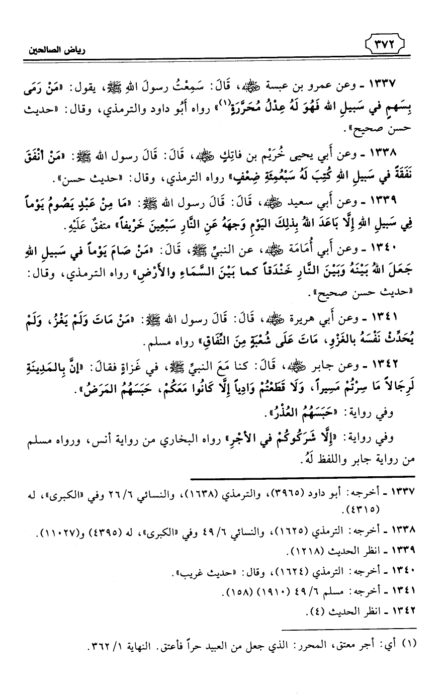 1337 - وعن عمرو بن عبسة - رضي الله عنه - قَالَ: سَمِعْتُ رسولَ اللهِ - صلى الله عليه وسلم - يقول: «مَنْ رَمَى بِسَهْمٍ في سَبيلِ اللهِ فَهُوَ لَهُ عِدْلُ مُحَرَّرَةٍ (¬1)». رواه أَبُو داود والترمذي، (¬2) وقال: «حديث حسن صحيح».