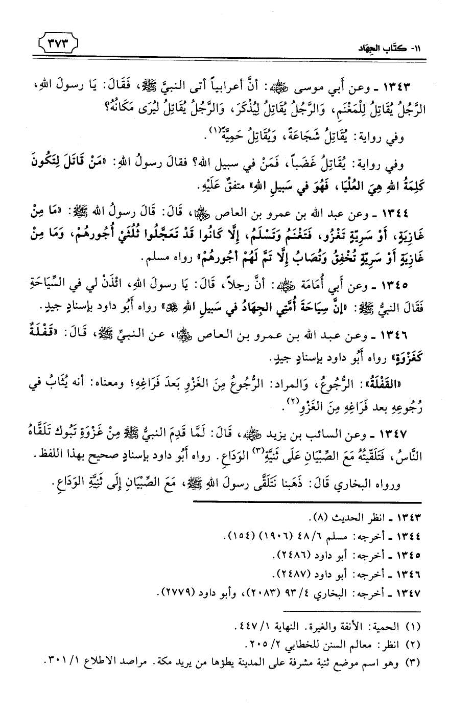 1346 - وعن عبد الله بن عمرو بن العاص رضي الله عنهما، عن النبيِّ - صلى الله عليه وسلم - قَالَ: «قَفْلَةٌ كَغَزْوَةٍ». رواه أَبُو داود بإسنادٍ جيدٍ. (¬1)