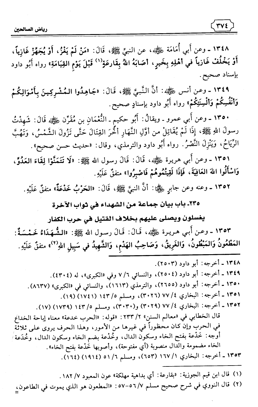 1349 - وعن أنس - رضي الله عنه: أنَّ النَّبيَّ - صلى الله عليه وسلم - قَالَ: «جَاهِدُوا المُشْرِكِينَ بِأَمْوَالِكُمْ وَأنْفُسِكُمْ وَألْسِنَتِكُمْ». رواه أَبُو داود بإسنادٍ صحيح. (¬1)