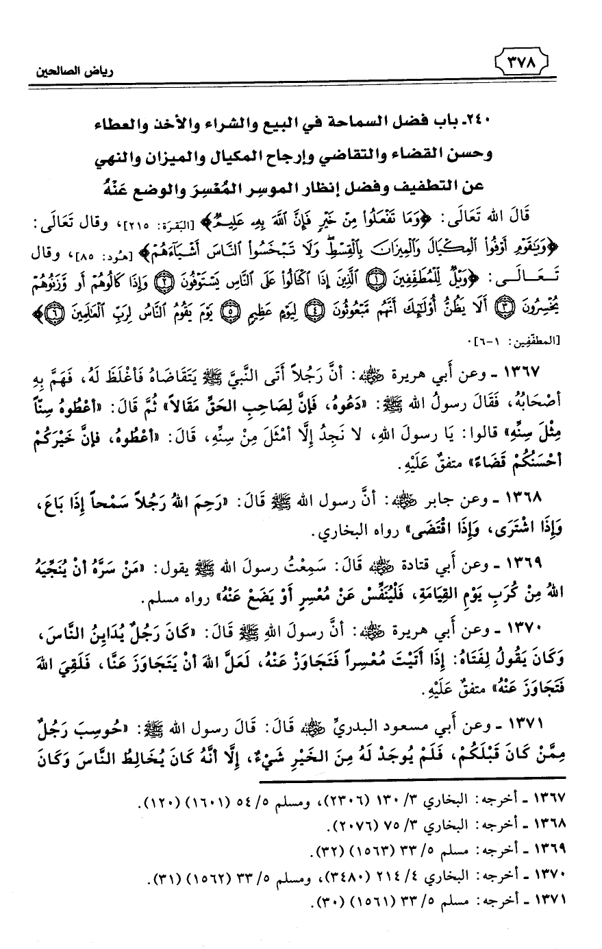 240 - باب فضل السماحة في البيع والشراء والأخذ والعطاء وحسن القضاء والتقاضي وإرجاح المكيال والميزان، والنهي عن التطفيف وفضل إنظار الموسِر المُعْسِرَ والوضع عَنْهُ