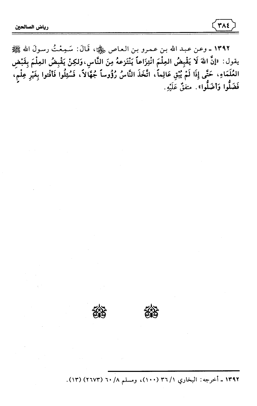 1392 - وعن عبد الله بن عمرو بن العاص رضي الله عنهما، قَالَ: سَمِعْتُ رسولَ الله - صلى الله عليه وسلم - يقول: «إنَّ اللهَ لاَ يَقْبِضُ العِلْمَ انْتِزَاعًا يَنْتَزعهُ مِنَ النَّاسِ، وَلكِنْ يَقْبِضُ العِلْمَ بِقَبْضِ العُلَمَاءِ، حَتَّى إِذَا لَمْ يُبْقِ عَالِمًا، اتَّخَذَ النَّاسُ رُؤُوسًا جُهَّالًا، فَسُئِلُوا فَأفْتوا بِغَيْرِ عِلْمٍ، فَضَلُّوا وَأضَلُّوا». متفقٌ عَلَيْهِ (¬1).