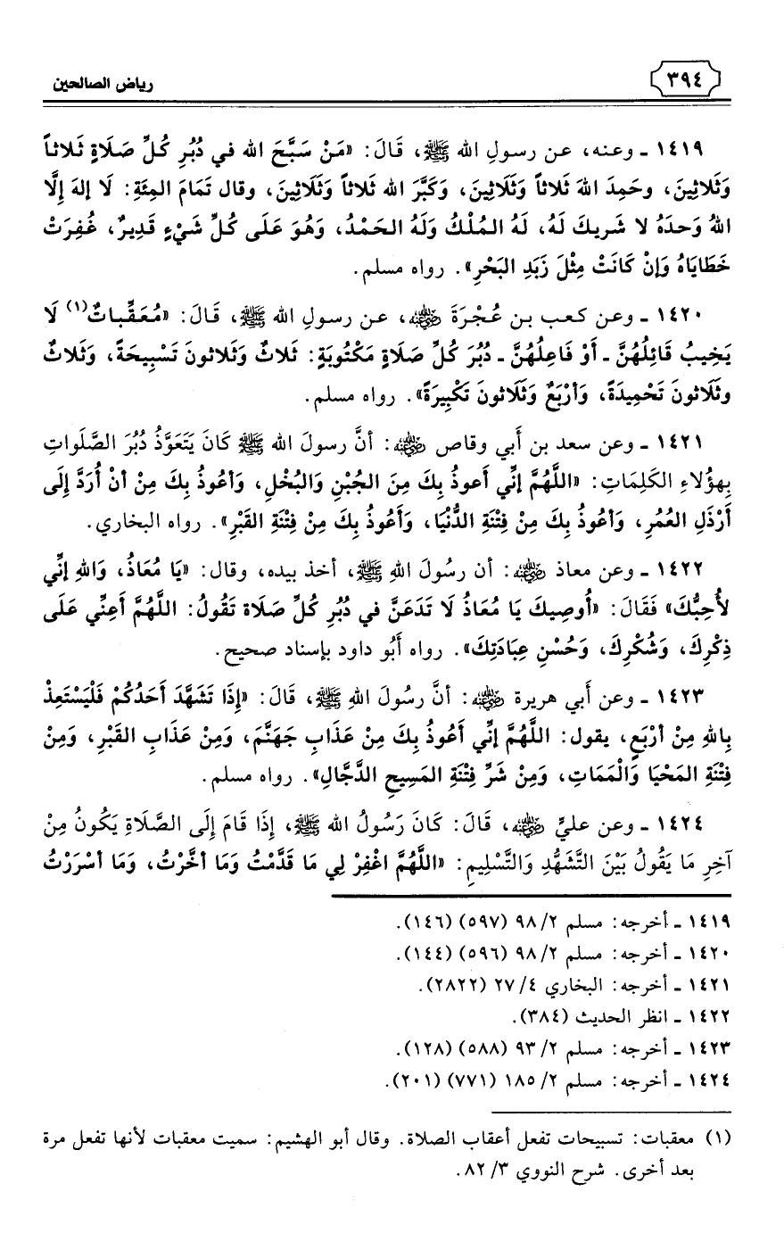 1419 - وعنه، عن رسولِ الله - صلى الله عليه وسلم - قَالَ: «مَنْ سَبَّحَ الله في دُبُرِ كُلِّ صَلاَةٍ ثَلاثًا وَثَلاثِينَ، وحَمِدَ اللهَ ثَلاثًا وَثَلاَثِينَ، وَكَبَّرَ الله ثَلاثًا وَثَلاَثِينَ، وقال تَمَامَ المِائَةِ: لاَ إلهَ إِلاَّ اللهُ وَحدَهُ لا شَريكَ لَهُ، لَهُ المُلْكُ وَلَهُ الحَمْدُ، وَهُوَ عَلَى كُلِّ شَيْءٍ قَدِيرٌ، غُفِرَتْ خَطَايَاهُ وَإنْ كَانَتْ مِثْلَ زَبَدِ البَحْرِ». رواه مسلم. (¬1)