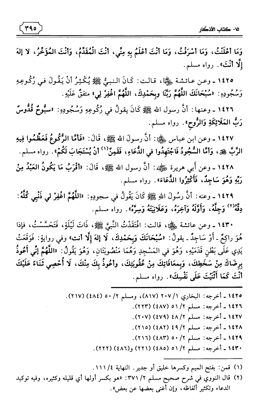 1430 - وعن عائشة رَضِيَ اللهُ عنها، قالت: افْتَقَدْتُ النَّبيَّ - صلى الله عليه وسلم - ذَاتَ لَيْلَةٍ، فَتَحَسَّسْتُ، فإذا هُوَ راكِعٌ - أَوْ سَاجِدٌ - يقولُ: «سُبْحَانَكَ وَبِحَمْدِكَ، لاَ إلهَ إِلاَّ أنت» وفي روايةٍ: فَوَقَعَتْ يَدِي عَلَى بَطْنِ قَدَمَيْهِ، وَهُوَ في المَسْجِدِ وَهُمَا مَنْصُوبَتَانِ، وَهُوَ يَقُولُ: «اللَّهُمَّ إنِّي أَعُوذُ بِرِضَاكَ مِنْ سَخَطِكَ، وَبِمعَافَاتِكَ مِنْ عُقُوبَتِكَ، وأعُوذُ بِكَ مِنْكَ، لاَ أُحْصِي ثَنَاءً عَلَيْكَ أنْتَ كَمَا أَثْنَيْتَ عَلَى نَفْسِكَ». رواه مسلم. (¬1)