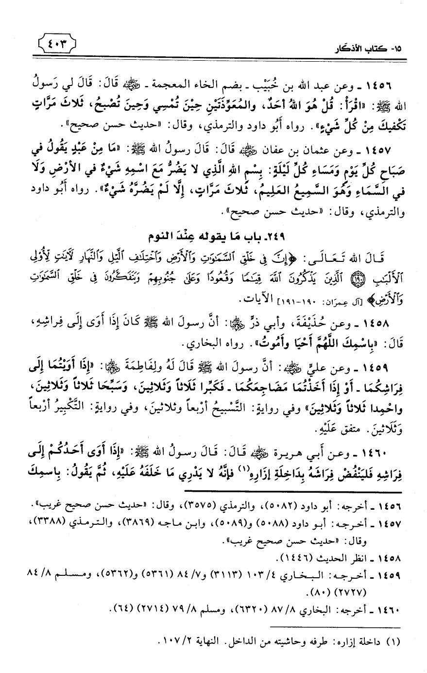 1456 - وعن عبد الله بن خُبَيْب - بضم الخاء المعجمة - رضي الله عنه - قَالَ: قَالَ لي رَسولُ الله - صلى الله عليه وسلم: «اقْرَأْ: قُلْ هُوَ اللهُ أحَدٌ، والمُعَوِّذَتَيْنِ حِيْنَ تُمْسِي وَحِينَ تُصْبحُ، ثَلاثَ مَرَّاتٍ تَكْفيكَ مِنْ كُلِّ شَيْءٍ». رواه أَبُو داود والترمذي، (¬1) وقال: «حديث حسن صحيح».